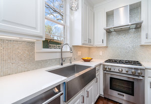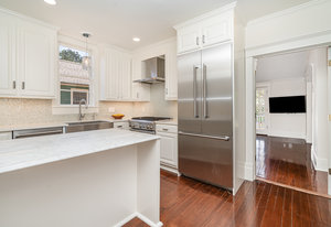 Kitchen: Thermador appliances/Carrera marble-top island/quartz cntertops.