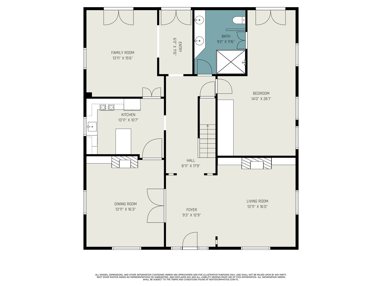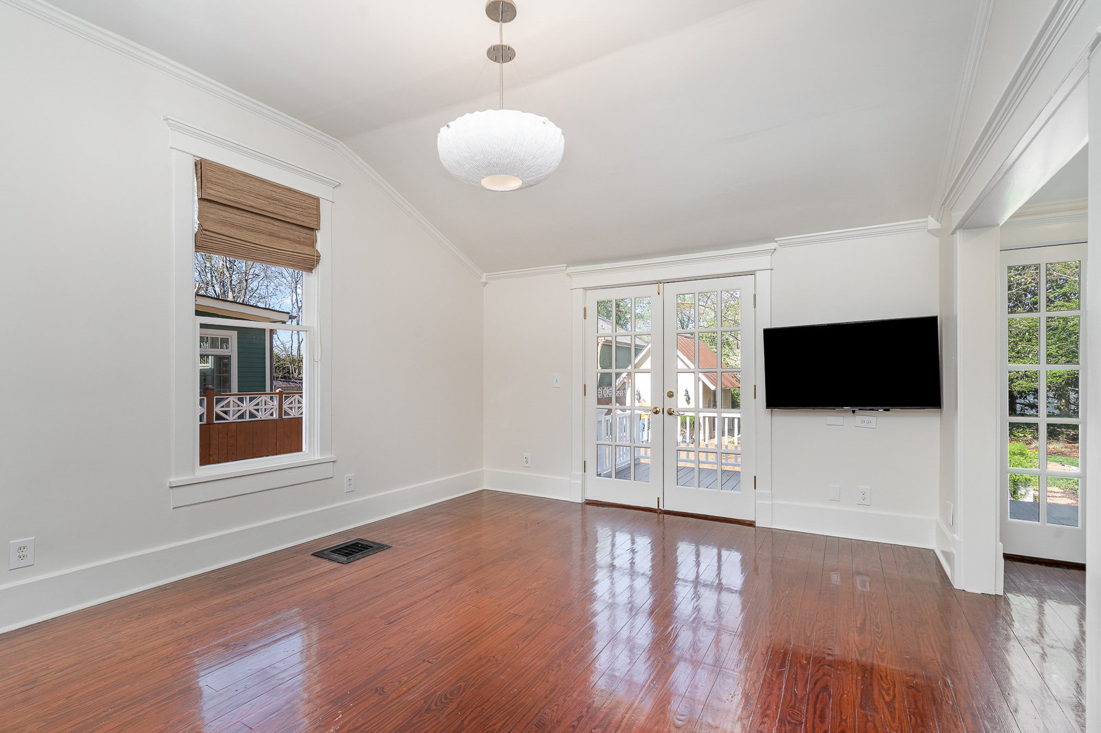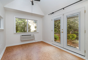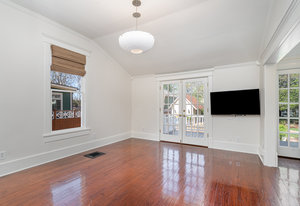 Fam Rm: Glass French doors/flat-screen TV/blinds.