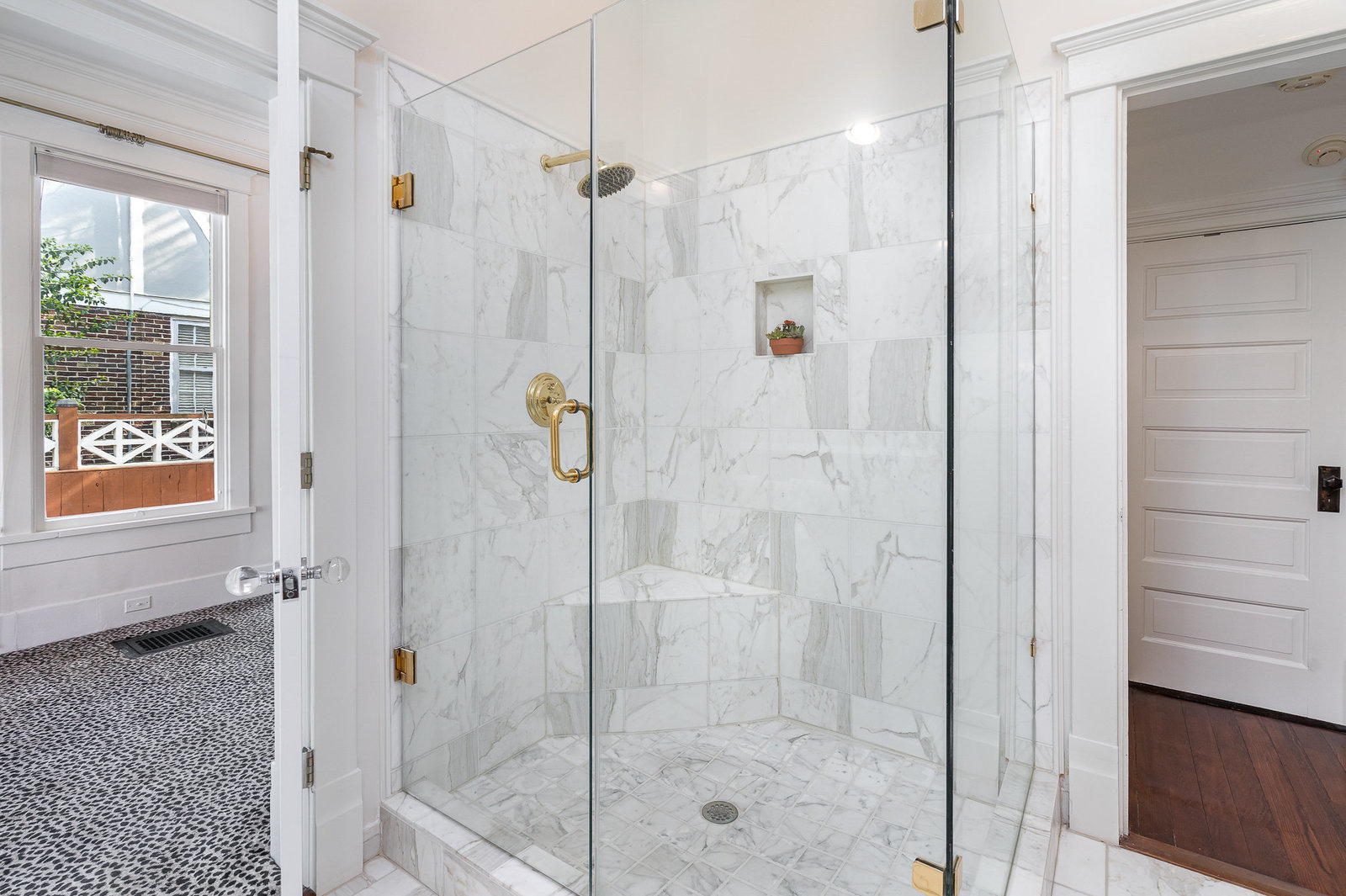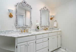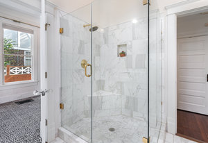 Downstairs Bath: Calacutta Gold marble floor/shower.