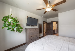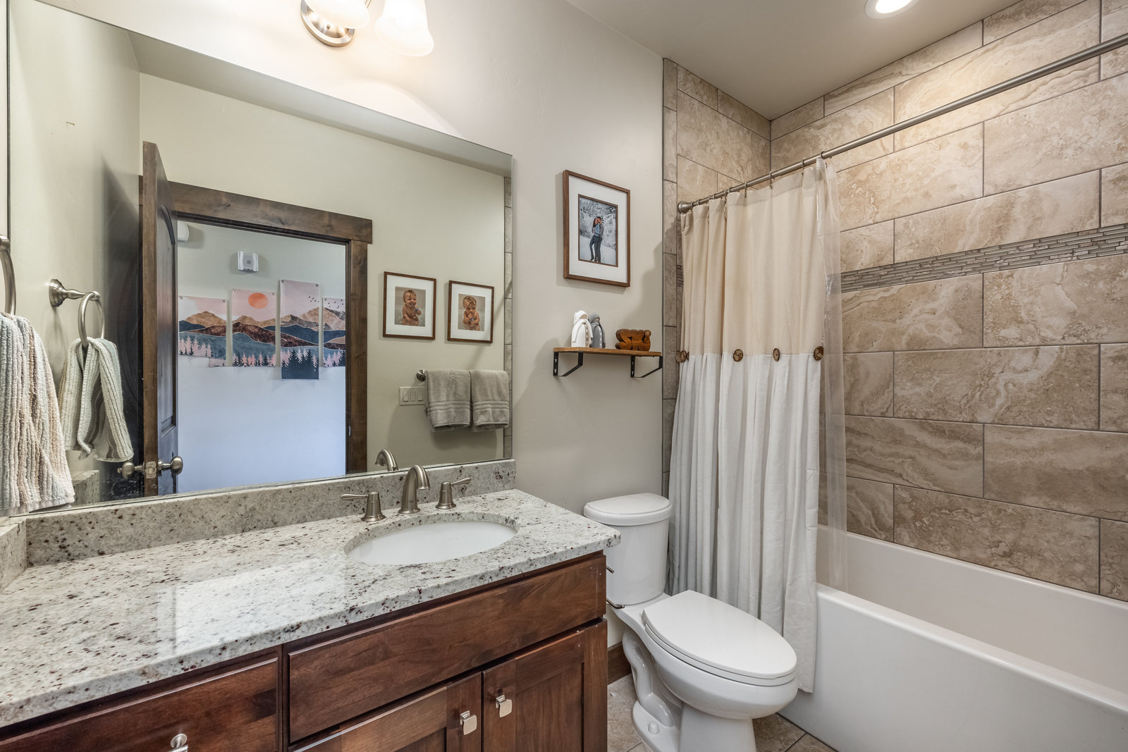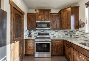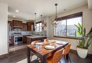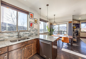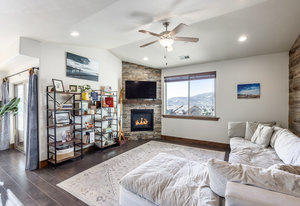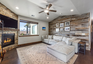 Vaulted ceilings and oversized windows fill the living room with natural light, while reclaimed 80-year-old Wyoming snow fence accent walls and a floor-to-ceiling stone fireplace bring warmth and character. The chef’s kitchen features granite countertops, stainless steel appliances, custom backsplash, and bar seating perfect for entertaining. Wide-plank hardwood flooring, ...