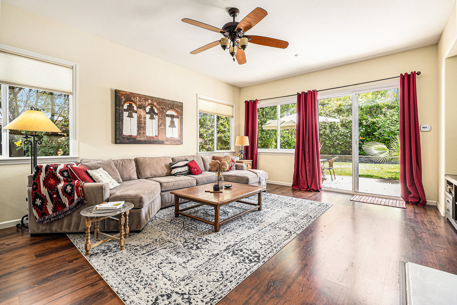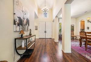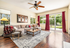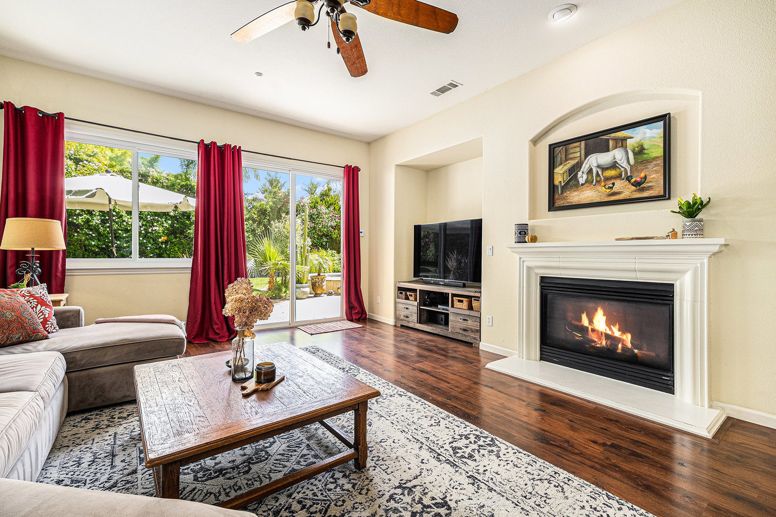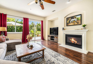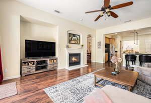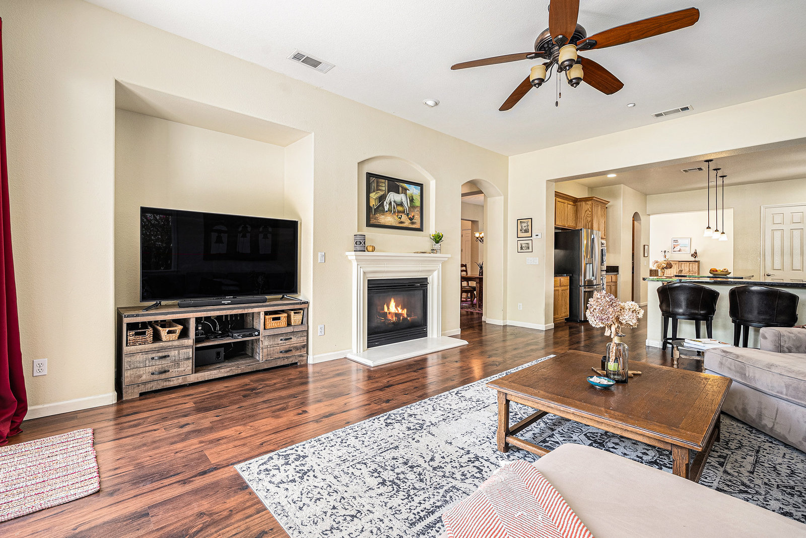 Step into this inviting open floor plan, featuring soaring high ceilings and stylish, low-maintenance laminate flooring throughout. The comfortable family room with plenty of natural light is anchored by a cozy gas fireplace—perfect for relaxing evenings or entertaining guests.