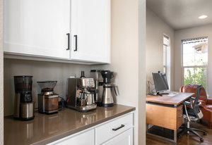 The flexible formal dining area can serve as a sitting room or easily be returned to its original purpose. The updated kitchen includes refinished cabinets, quartz countertops, stainless steel appliances,a large island, and a coffee nook to complete the space. The informal dining area opens to a bright living room with a stone-accented gas fireplace and sunny south-facing windows.