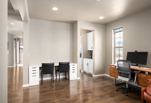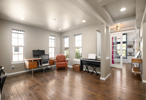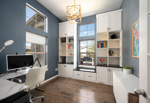 Inside, the main level features pristine wood floors and a dedicated front office with custom built-ins—perfect for working from home. A mudroom and powder bath off the garage add convenience.