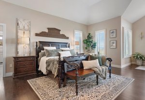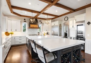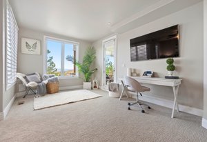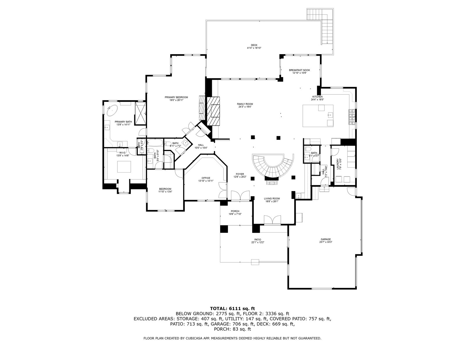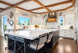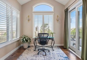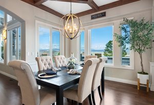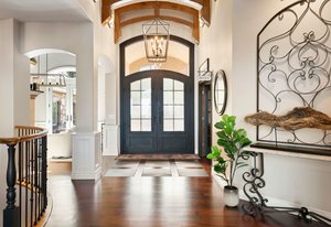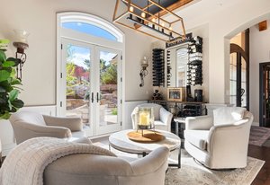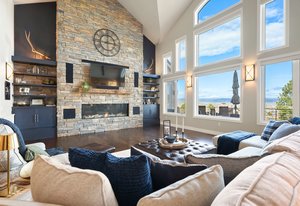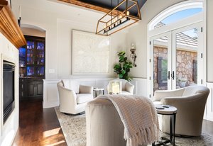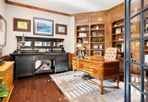 Step through the custom front entry door into a dramatic two-story foyer highlighted by wood beam accents and rich walnut hardwood floors throughout most of the main level. The thoughtfully redesigned interior includes a spectacular great room with a 20-ft vaulted ceiling and a full wall of windows that showcase stunning mountain vistas. A set of French doors opens to a refined office with custom curved built-ins, ideal for remote work or a private study.
