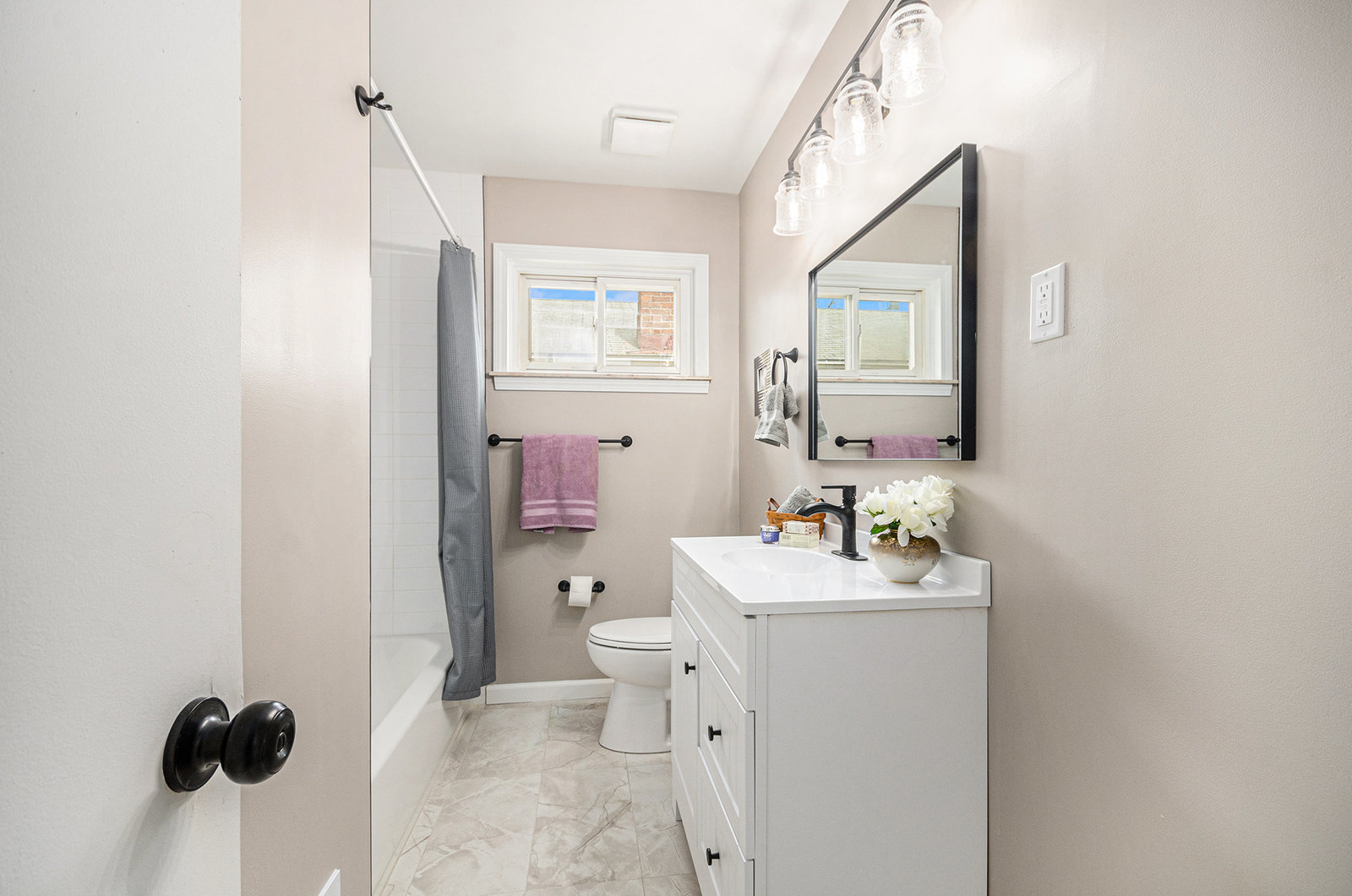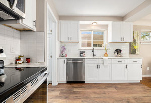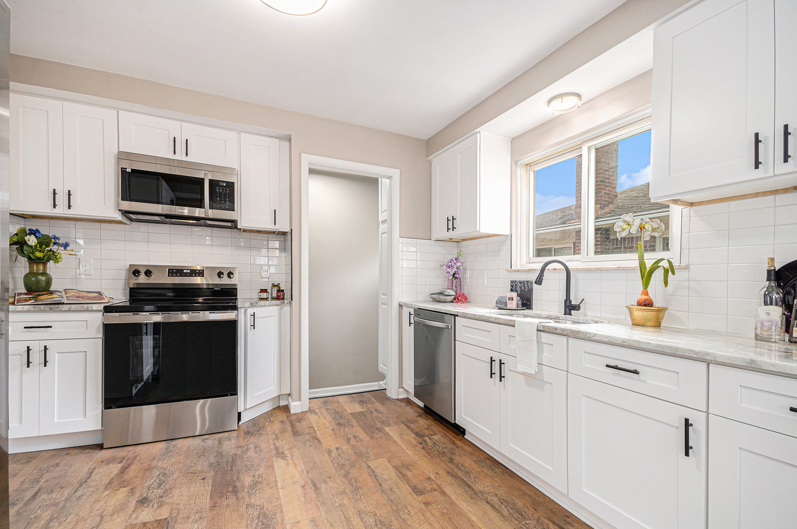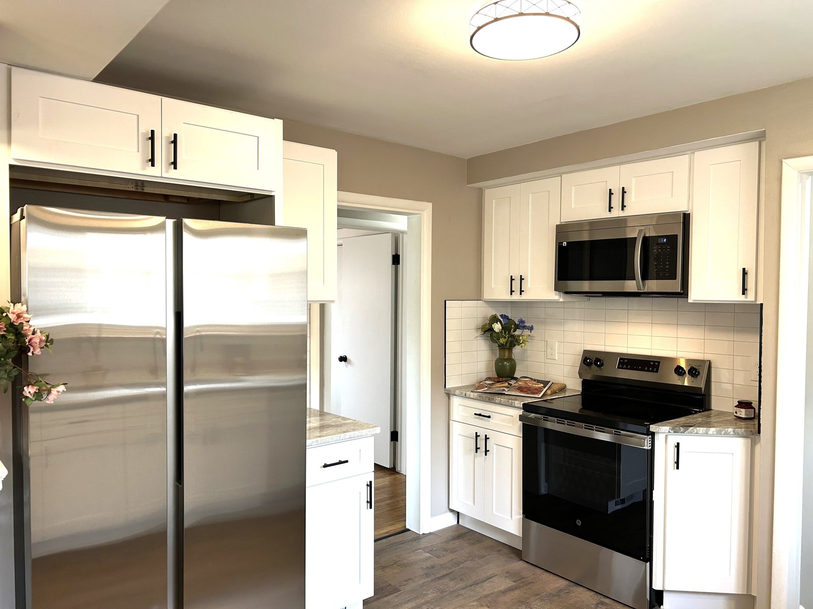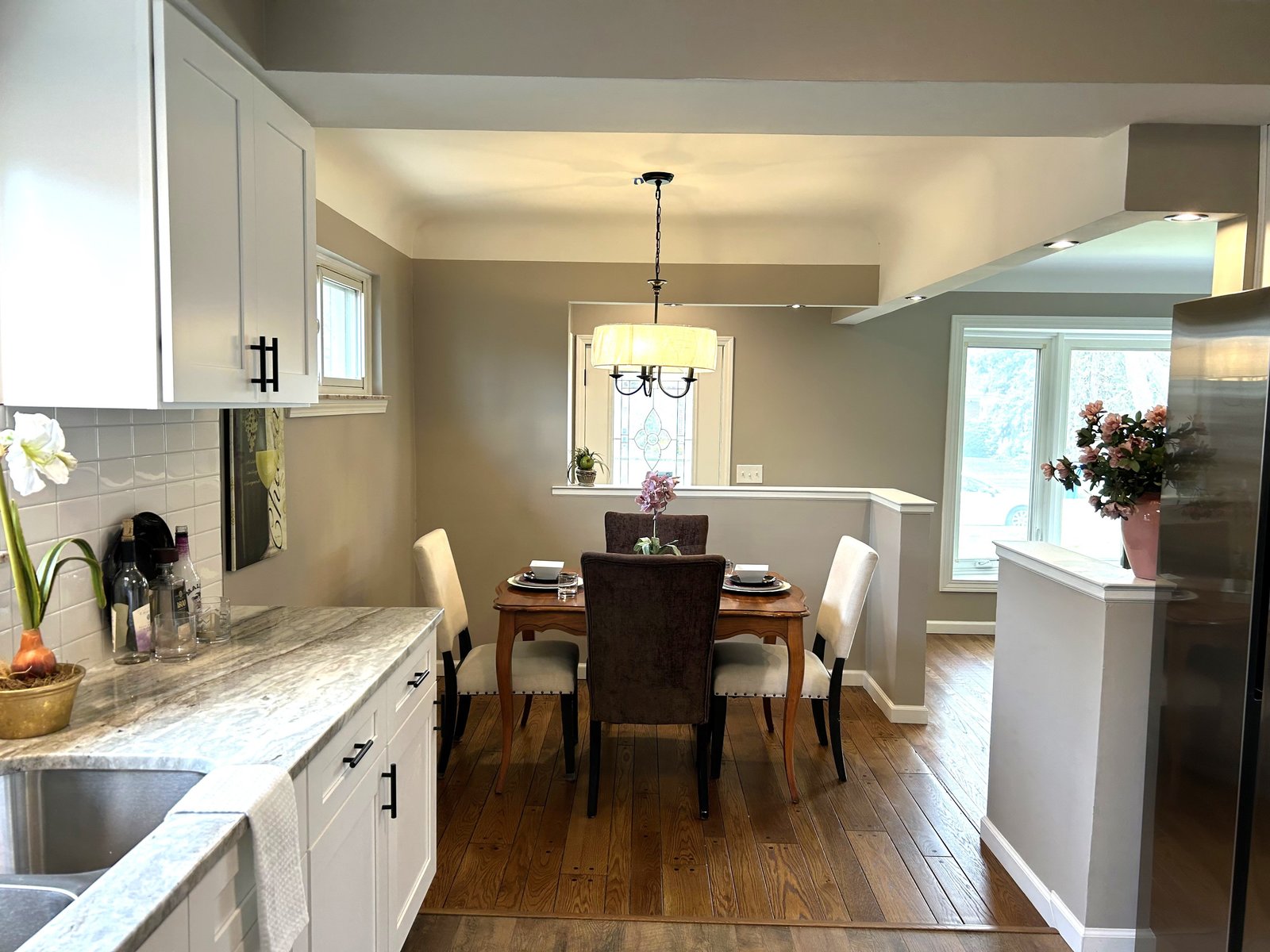 Beautifully remodeled 2025 brick ranch with a flowing floor plan and stylish updates throughout! The spacious living room is filled with natural light from the large bay window and features a cozy fieldstone fireplace, recessed lighting, and classic cove ceilings. The impressive kitchen offers granite countertops, white soft-close cabinets, white ceramic backsplash, brand-new stainless steel appliances, and a generous breakfast nook. Hardwood flooring extends through most of the main level. The primary bedroom includes two closets and a door leading to the backyard. Both full bathrooms—one on the main floor and one in the finished basement—are deluxe and updated. The finished basement includes luxury vinyl plank flooring, recessed lighting, glass block windows, and a large laundry room. Enjoy the outdoors in the nicely sized fenced backyard with a brick paver patio and a 2-car garage. A fantastic move-in-ready home with quality finishes!
