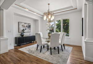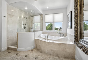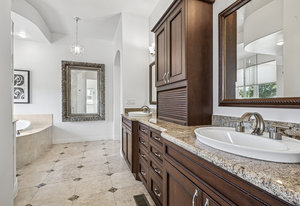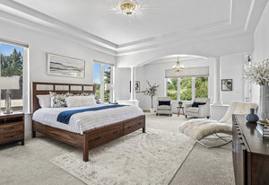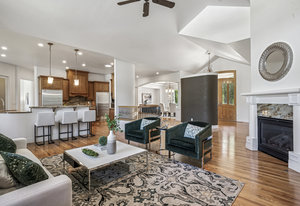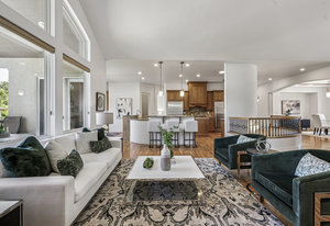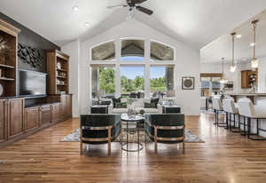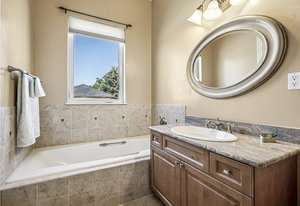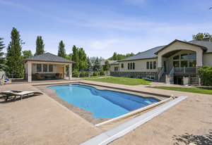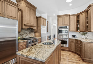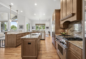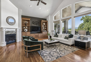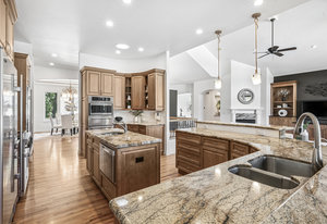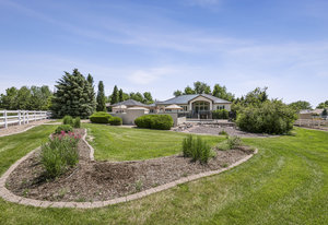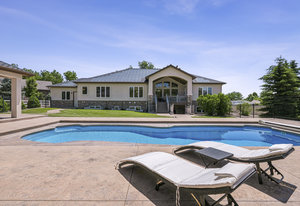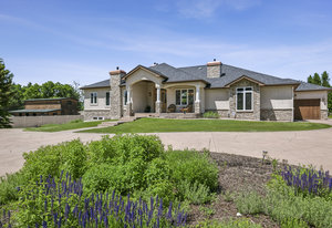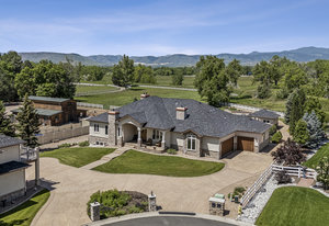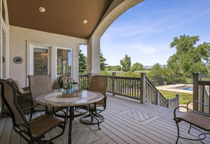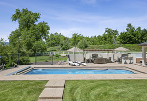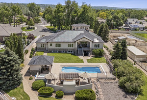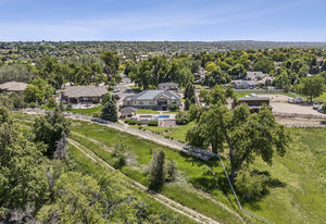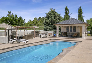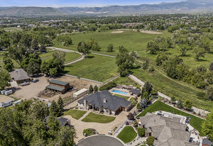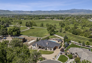 Located in Arvada’s coveted Eagleview Estates, this exceptional residence offers luxurious living with sweeping views of Colorado’s Front Range, including Mount Blue Sky. The main level features vaulted ceilings, a sunlit dining area, a private office with custom built-ins and a gas fireplace, and a beautiful great room with built-ins, a gas fireplace, and expansive windows that frame the serene mountain backdrop. The open-concept kitchen is a chef’s dream with slab granite countertops, custom cabinetry, and top-of-the-line appliances. The private primary suite is a true retreat, situated in its own wing with a sitting area, deck access, and incredible views. The spacious 5-piece bath includes a large fitted closet with a granite-top island, and a stack washer/dryer. The walk-out lower level includes three additional bedrooms—two with en-suite baths, a family room with full bar and covered patio access, and a custom movie theater with surround sound, velvet curtains, and stepped seating. Outside, enjoy a resort-style setting with a pool, hot tub, a pool house with changing room, an outdoor kitchen with built-in grill, a pergola-covered lounge, and a gas fireplace—all set against uninterrupted mountain views. A back gate leads directly to Arvada’s 150+ mile trail network and a bridle path to the neighborhood elementary school. This property also offers a detached 2-car garage with a fully finished guest house/flex space above that includes an open living room/studio space with mini-kitchen, 3/4 bath, central A/C and heat, and a west-facing balcony. Additional highlights include an attached 3-car garage, three laundry areas, new interior paint, and new carpet throughout the lower level, primary suite, and guest bedroom. This is Colorado living at its finest.