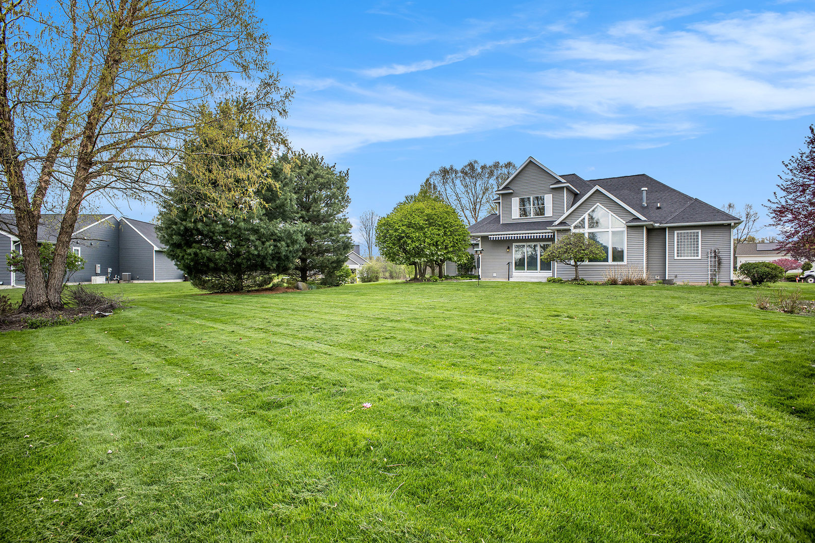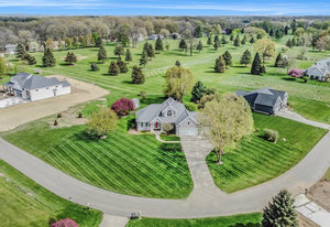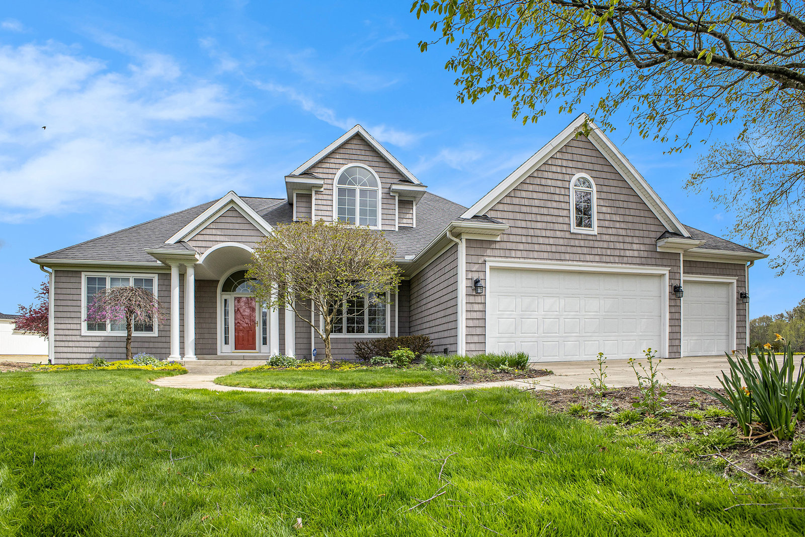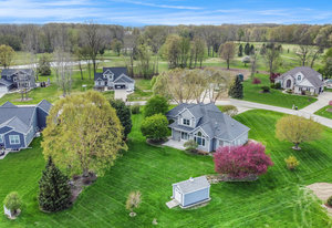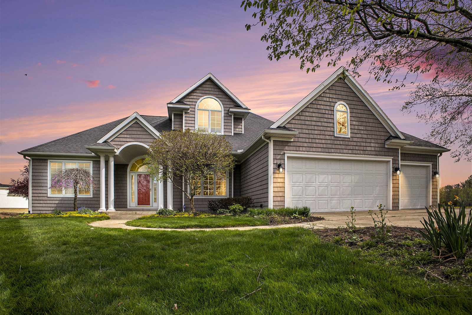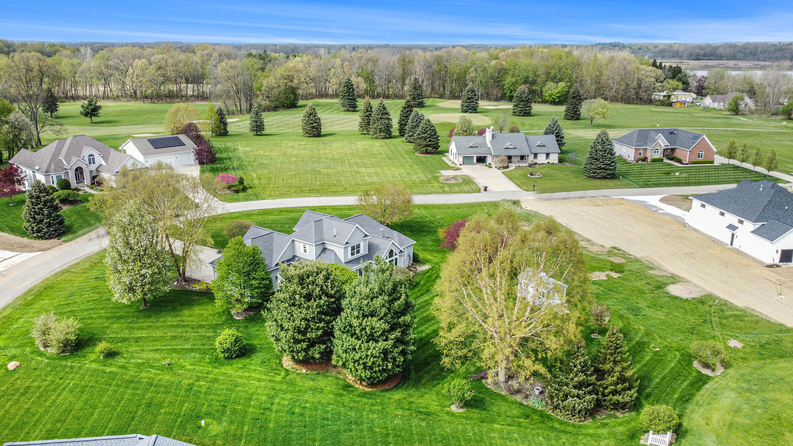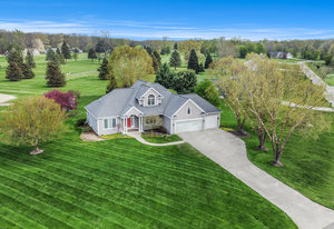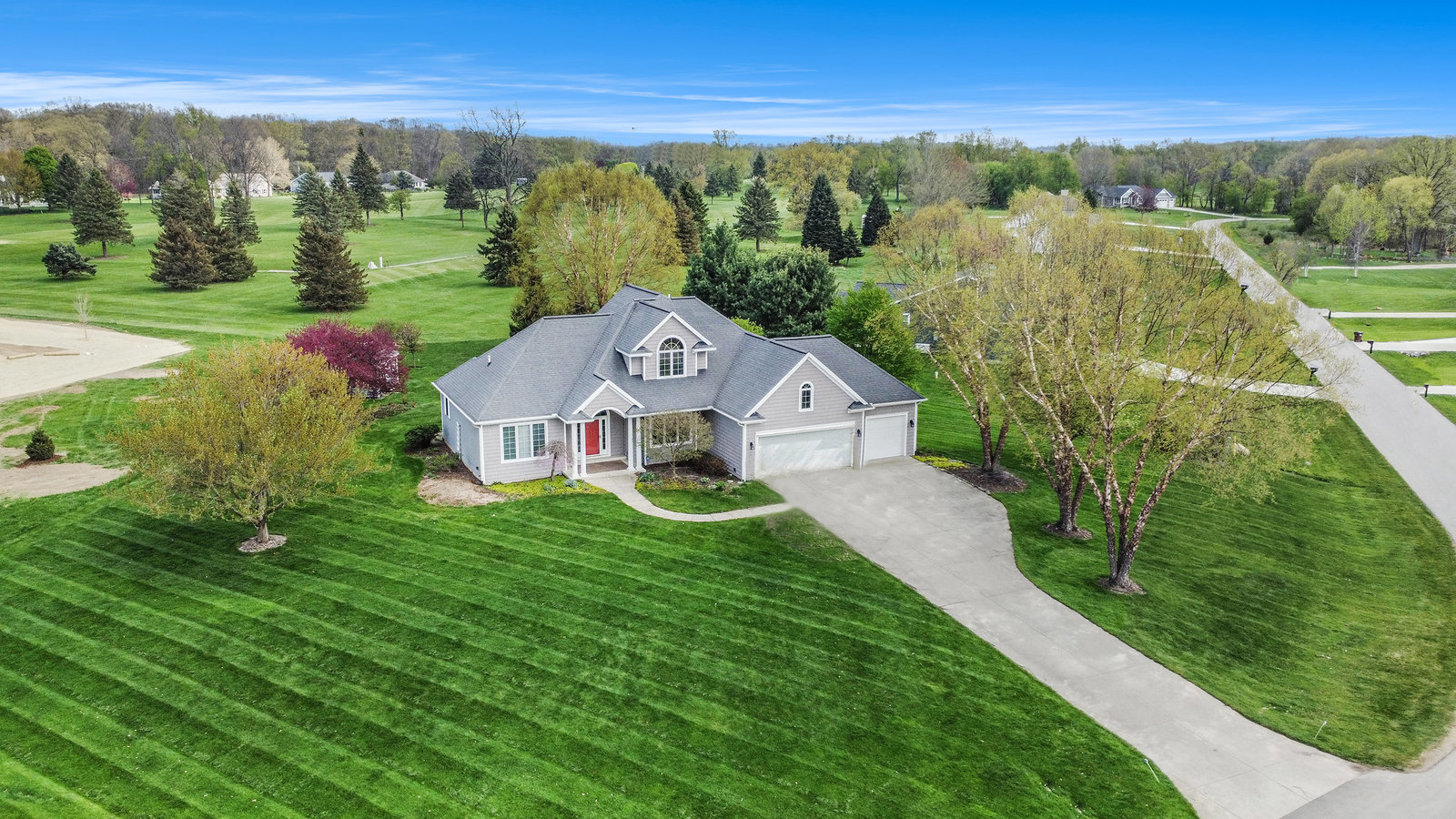 Impeccably maintained, this contemporary home sits on the tee box of Hole 6 with breathtaking views. The gourmet kitchen features maple cabinets, granite countertops, and a large island. The vaulted living room boasts a gas log fireplace and a wall of windows for abundant natural light. A formal dining room adds elegance. The main floor primary suite offers a luxurious bath with a soaking tub and shower. Upstairs, find two spacious bedrooms and a full bath. A full basement provides extra potential. Enjoy a professionally landscaped yard, concrete patio with power awning, storage shed, and a three-car garage with an epoxy floor.