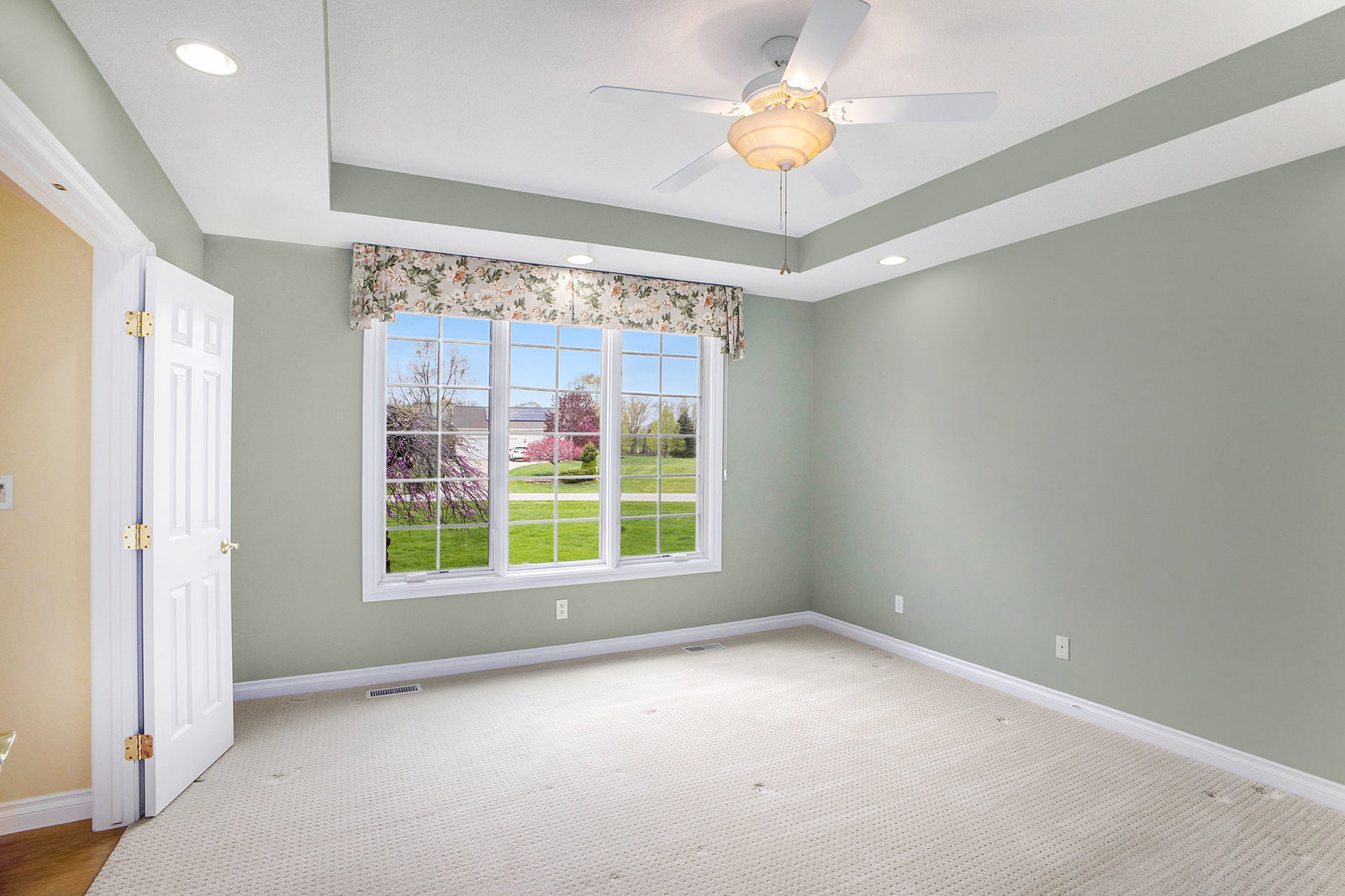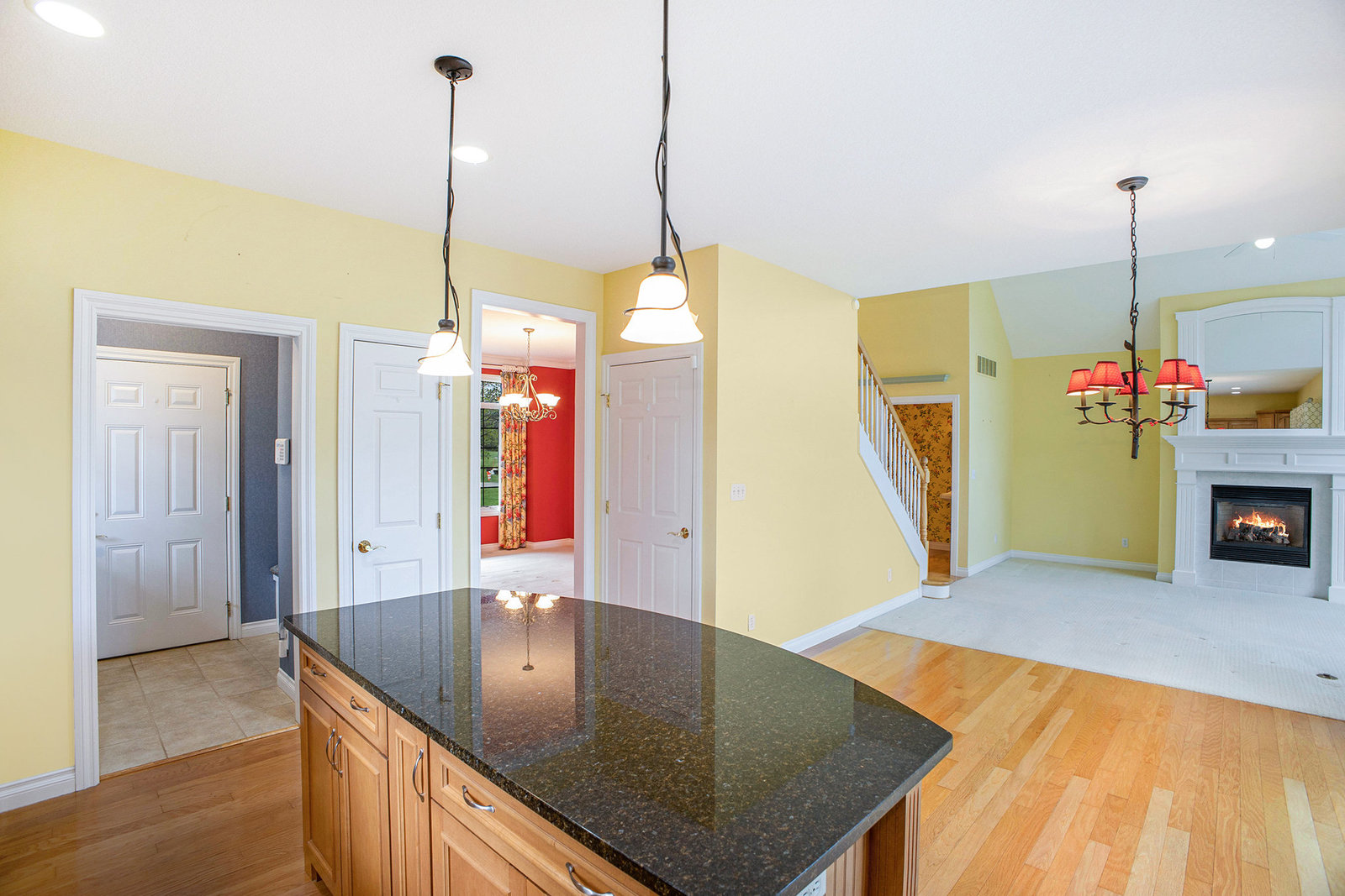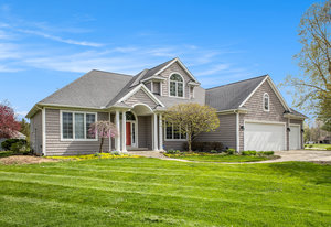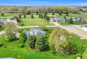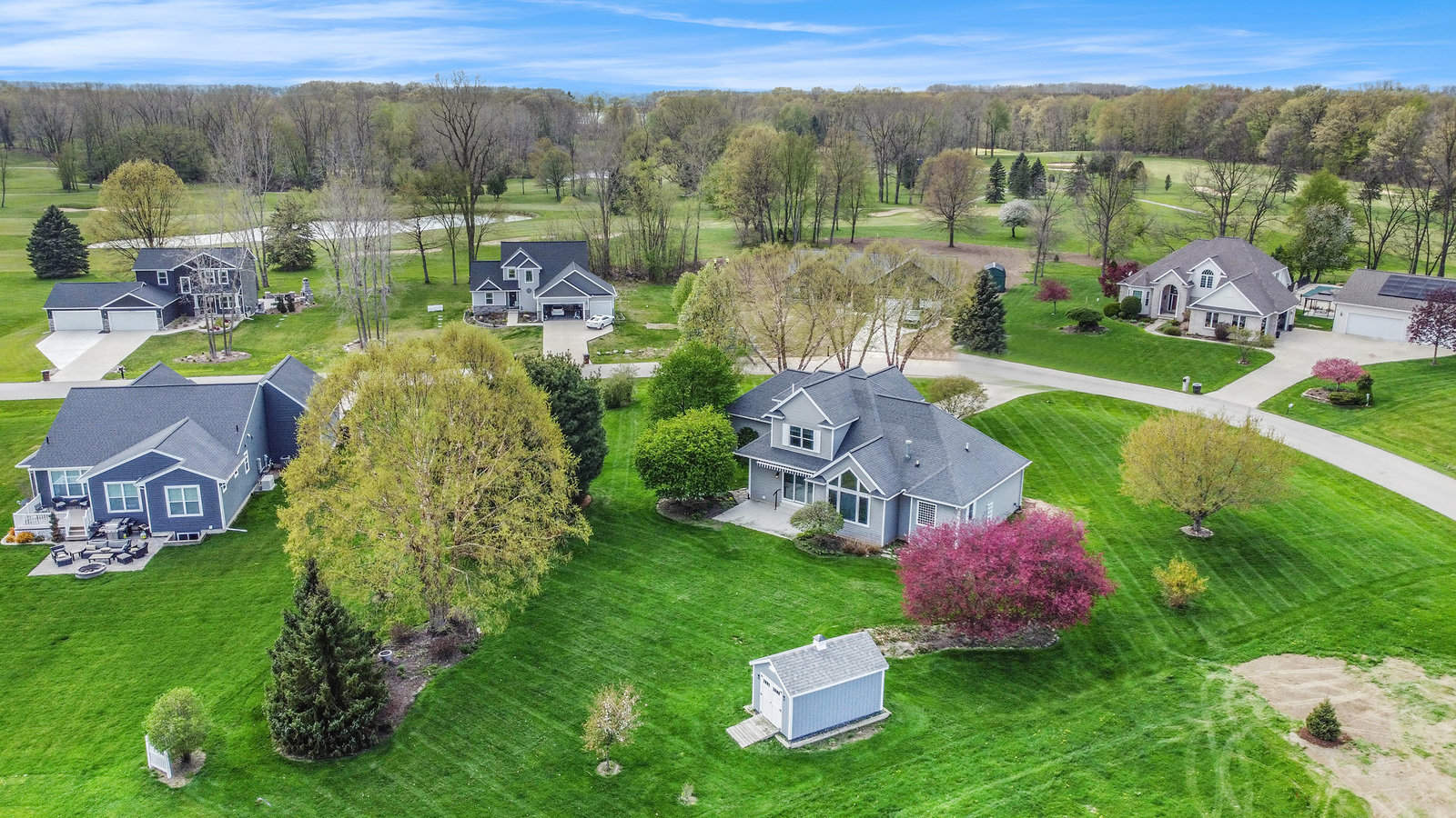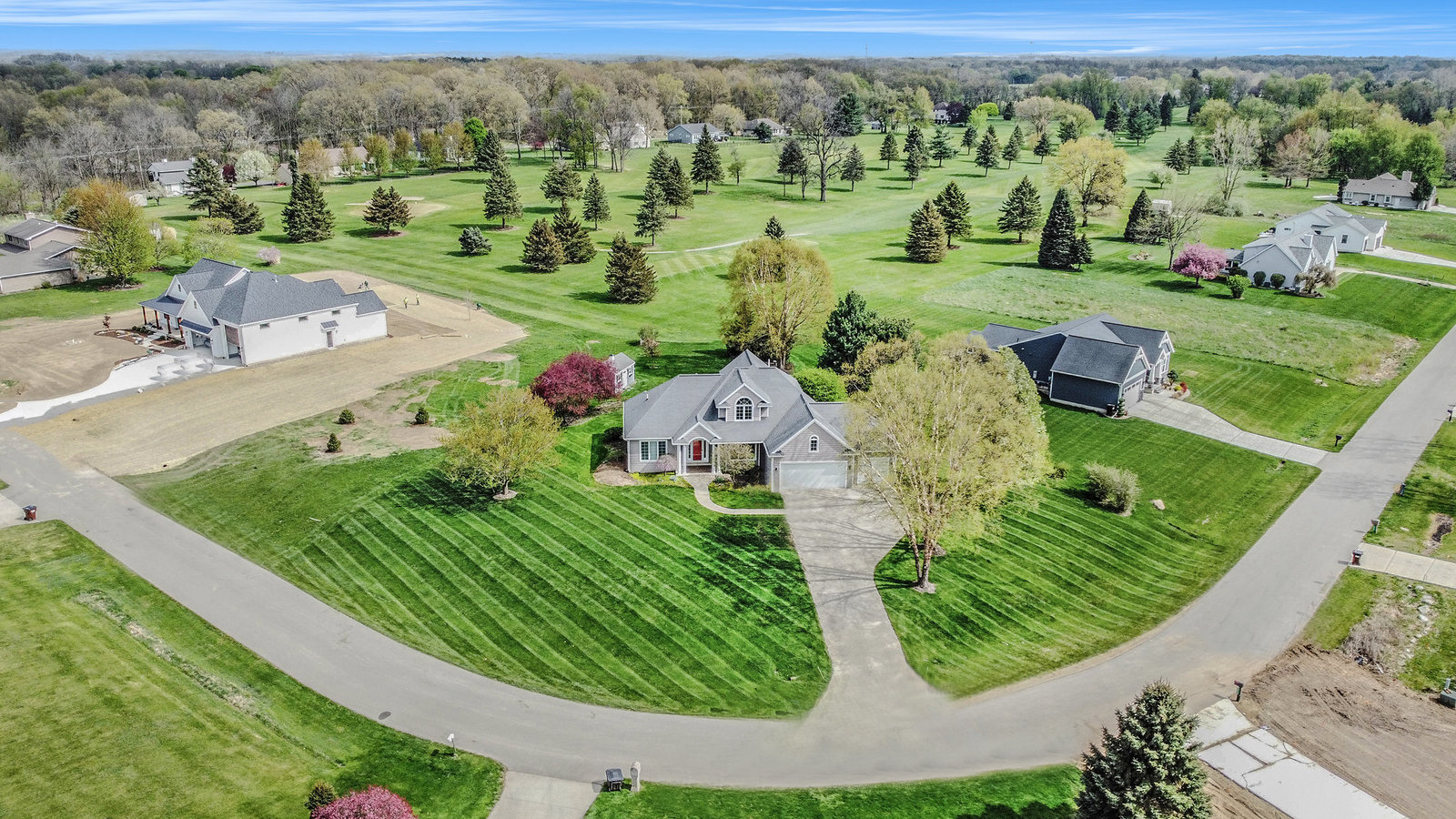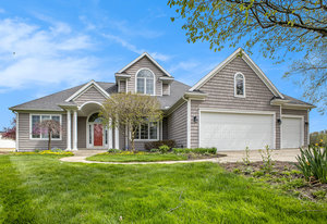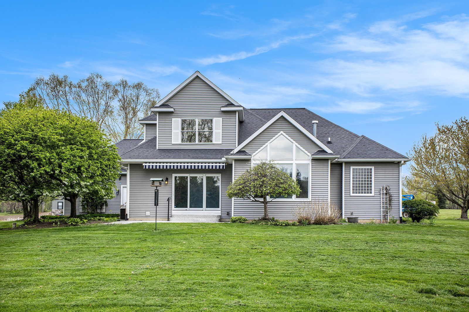 Impeccably maintained, this contemporary home sits on the tee box of Hole 6 with breathtaking views. The gourmet kitchen features maple cabinets, granite countertops, and a large island. The vaulted living room boasts a gas log fireplace and a wall of windows for abundant natural light. A formal dining room adds elegance. The main floor primary suite offers a luxurious bath with a soaking tub and shower. Upstairs, find two spacious bedrooms and a full bath. A full basement provides extra potential. Enjoy a professionally landscaped yard, concrete patio with power awning, storage shed, and a three-car garage with an epoxy floor.