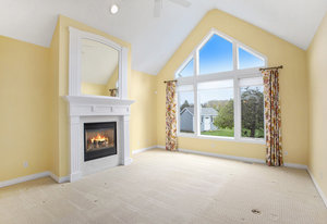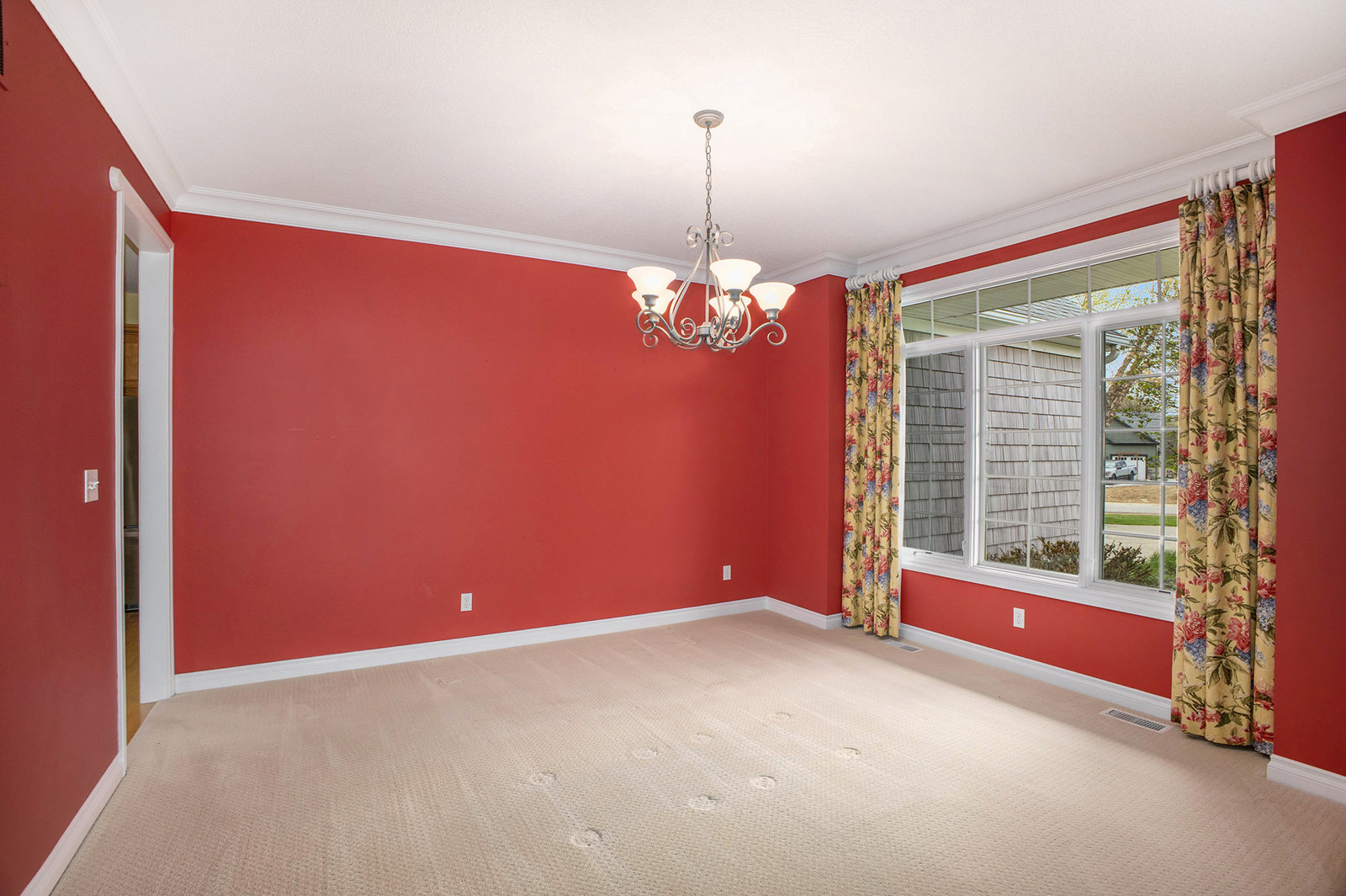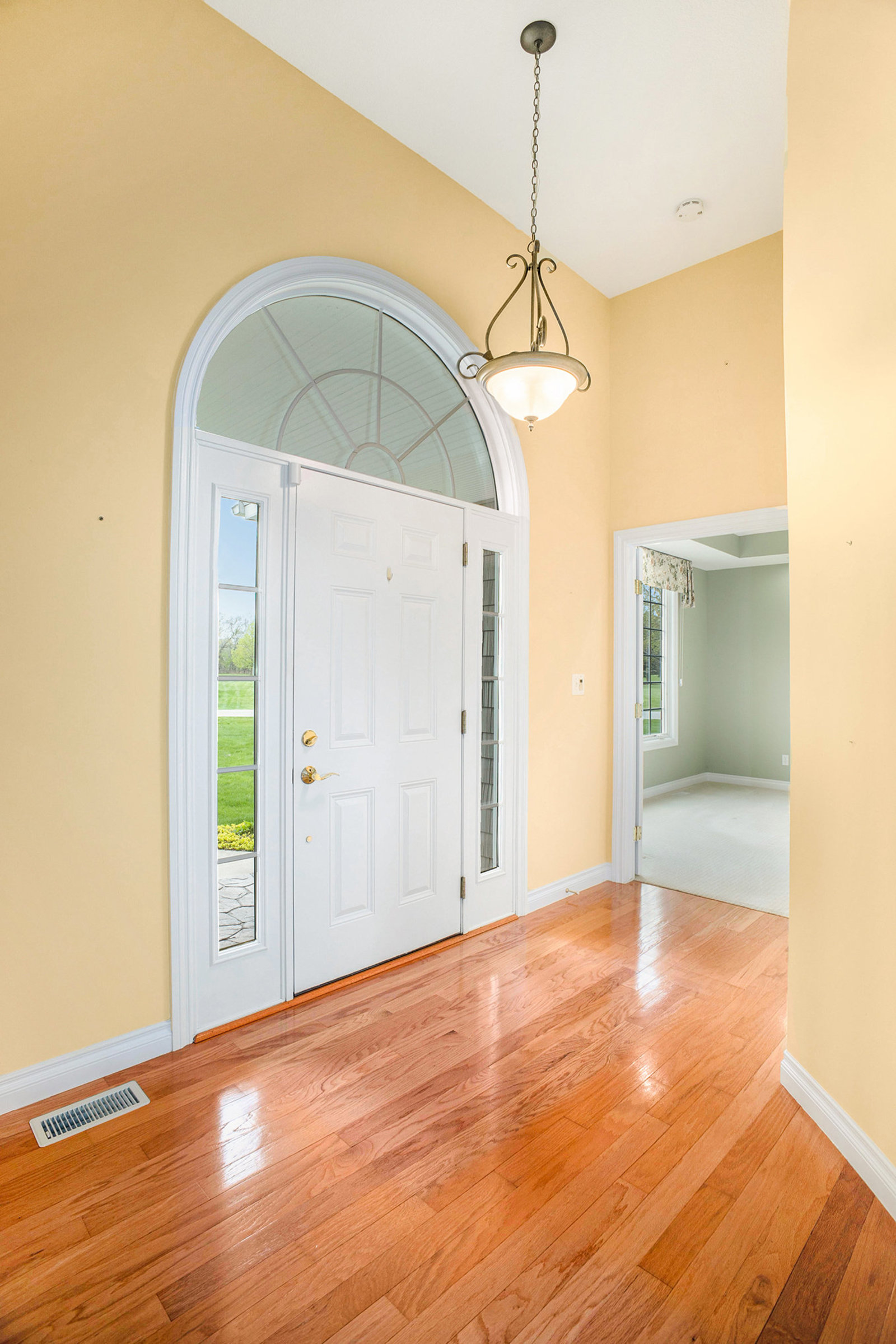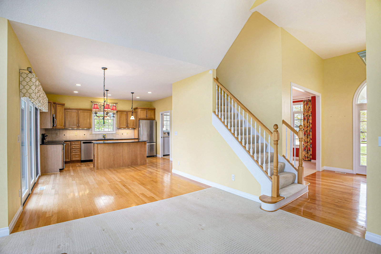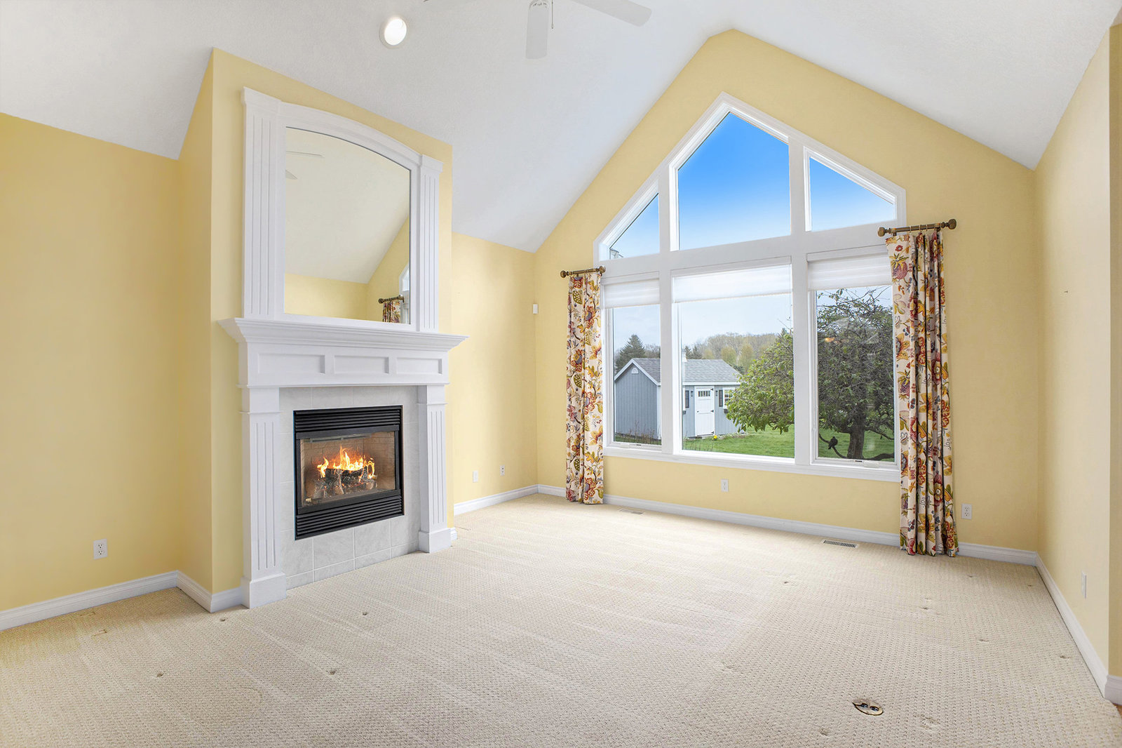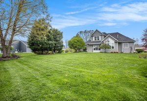 Impeccably maintained, this contemporary home sits on the tee box of Hole 6 with breathtaking views. The gourmet kitchen features maple cabinets, granite countertops, and a large island. The vaulted living room boasts a gas log fireplace and a wall of windows for abundant natural light. A formal dining room adds elegance. The main floor primary suite offers a luxurious bath with a soaking tub and shower. Upstairs, find two spacious bedrooms and a full bath. A full basement provides extra potential. Enjoy a professionally landscaped yard, concrete patio with power awning, storage shed, and a three-car garage with an epoxy floor.