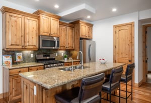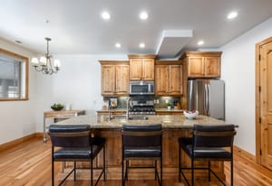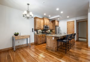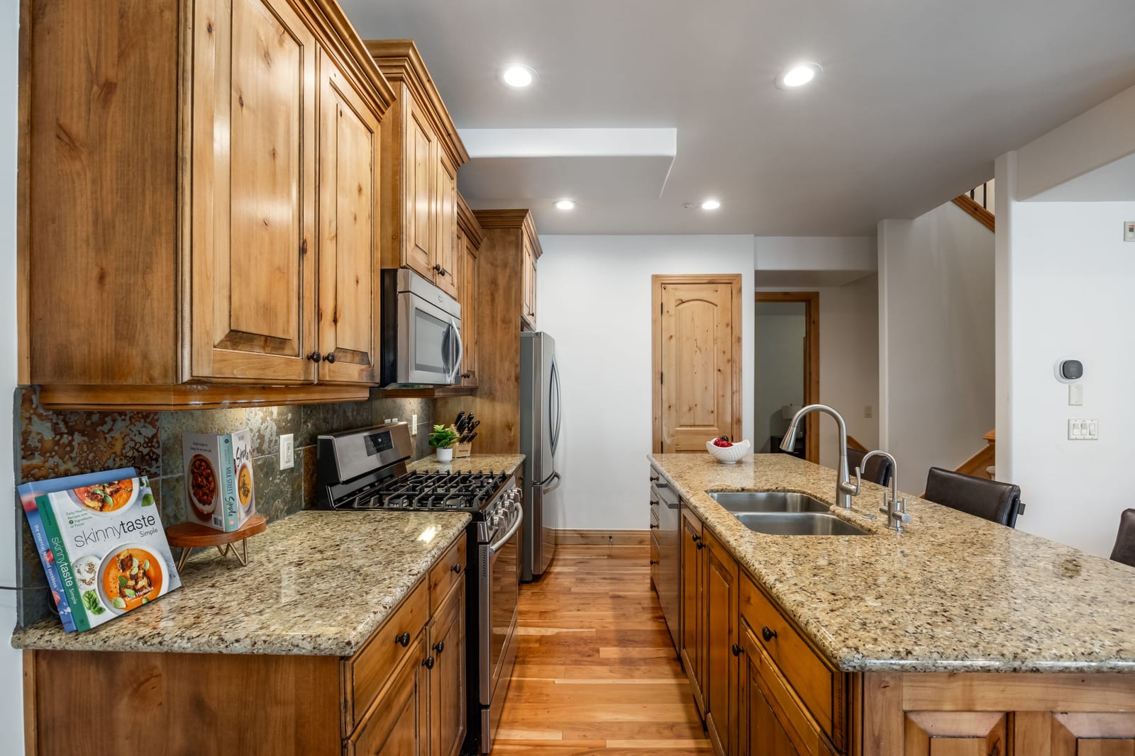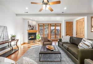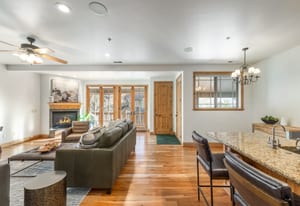 Inside, an open floor plan with soaring ceilings on every level creates a bright, inviting atmosphere. The main level features a spacious living room with a cozy gas fireplace, bar seating, and an informal dining area that opens to a large deck—ideal for ...