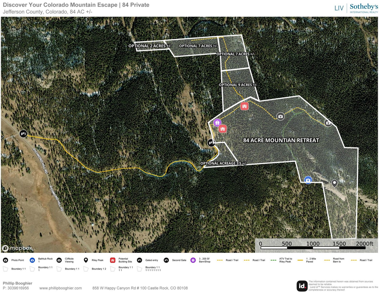 Experience 84 acres of pristine wilderness featuring the iconic Riley Peak, private gated access, a 40' x 80' outbuilding, a cliffside viewing pavilion, miles of private trails, abundant wildlife, and multiple ideal building sites—all just 30 miles from Denver.