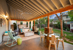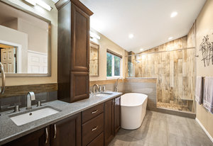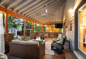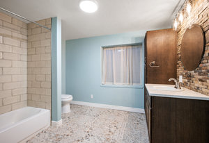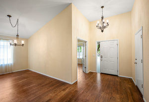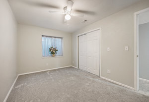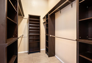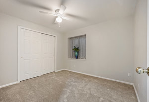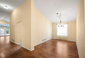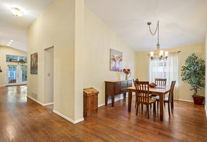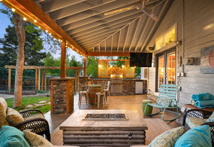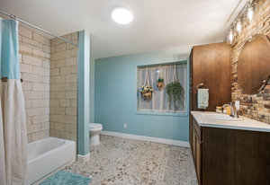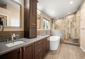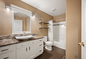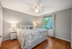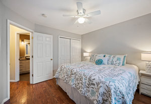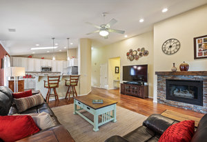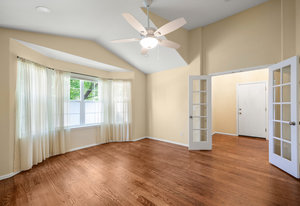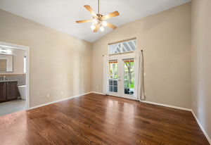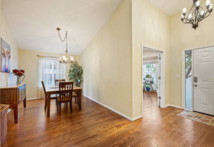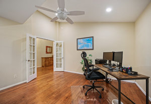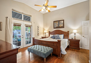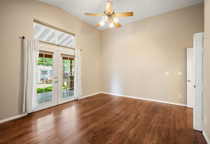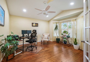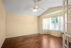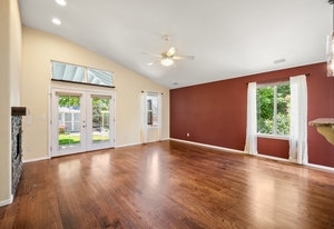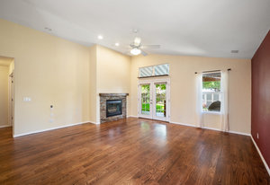 The open-concept floor plan includes a cozy kitchen and family room with a gas fireplace framed by stacked slate stone which lead to the amazing, covered patio with French doors. The spacious primary suite features a walk-in custom closet and a spa-like en-suite primary bath , renovated in 2017 with a soaking tub, walk-in shower with floating bench, quartz countertops, satin nickel hardware, and abundant cabinetry.