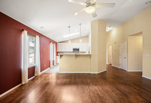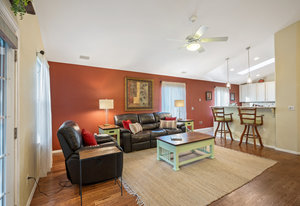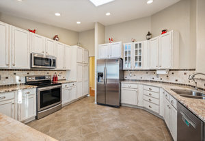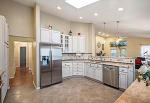 Welcome to this beautifully updated and meticulously maintained ranch style home offering a perfect blend of style, comfort, and functionality. Vaulted ceilings and rich hardwood floors create an airy and inviting main level, while recessed lighting enhances the ambiance in key areas like the kitchen, living room, office, and primary bath. The kitchen is a chef’s dream with slab granite counters, slate backsplash, a skylight for natural light, and cream distressed cabinetry offering generous storage.