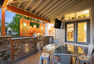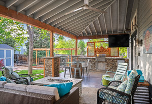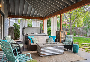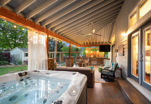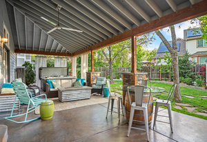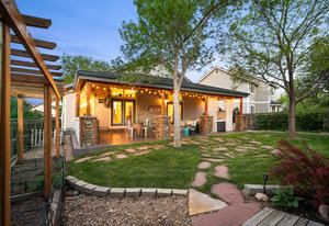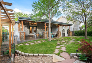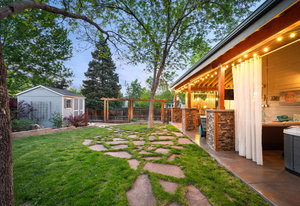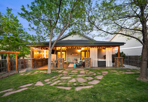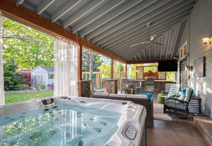Step outside to a stunning 582 sq ft covered patio with a stacked slate stone finish and a built-in outdoor kitchen with quartz counters, grill, burner, refrigerator, and storage. Relax in the 5-person hot tub or enjoy the professionally landscaped yard with raised garden beds and arbors.