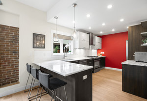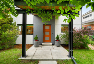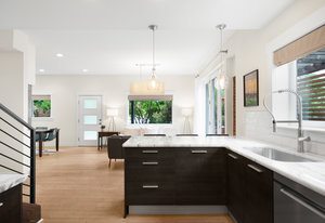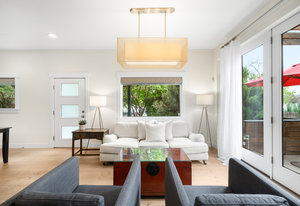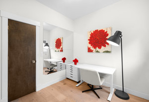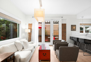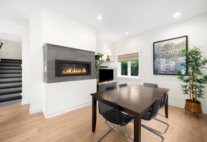An inviting front porch opens to a bright, open layout with high ceilings and seamless indoor-outdoor flow. The expansive great room is anchored by floor-to-ceiling glass doors that lead to a private patio wrapped in sleek Ipe wood fencing, creating a natural connection between dining, living, and entertaining spaces. The chef’s kitchen features large marble counters with seating, custom cabinetry, and stainless-steel appliances, complemented by a dining area highlighted by a statement fireplace and integrated shelving. A main-floor bedroom provides flexible use for a home office, studio, or fitness space.