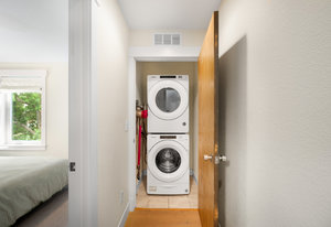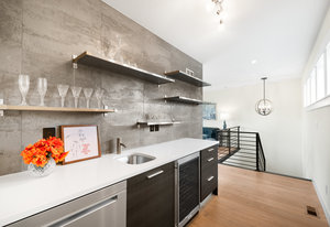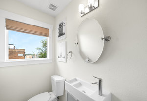 Upstairs, the primary suite serves as a calm retreat with a spa-style bath, glass shower, double vanity, and walk-in closet. Two additional bedrooms, a full hall bath and laundry complete the level. The top floor offers an impressive lounge with a wet bar, dishwasher, and wine fridge—opening to a covered rooftop deck with unobstructed downtown Denver skyline views. With a half bath on this floor, the space could easily transform into a guest suite.