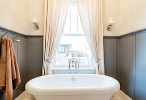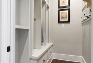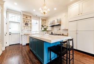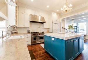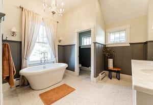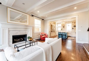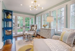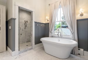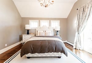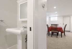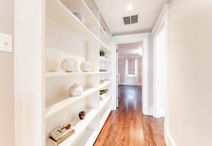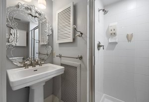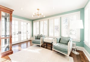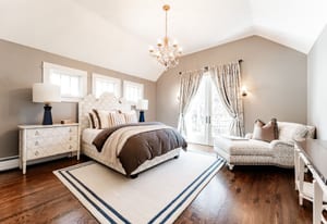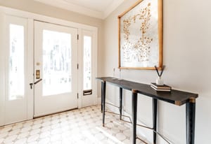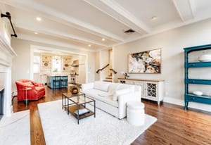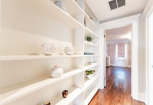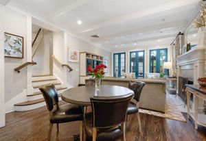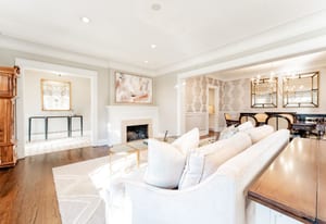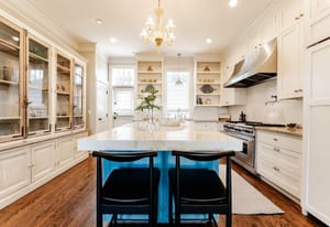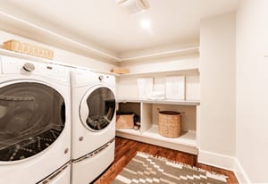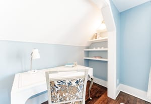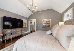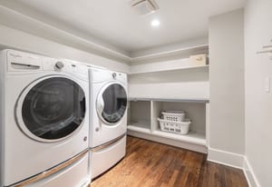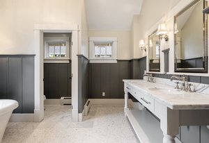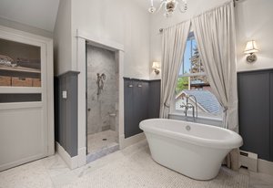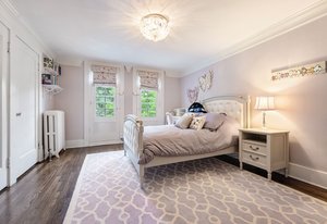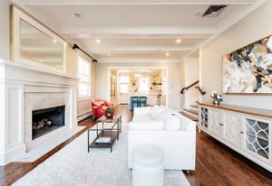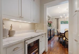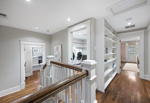 The sun-filled living room features a wood-burning fireplace and connects beautifully to both the sunroom and dining room. A spacious butler’s pantry elevates the home’s entertainment capabilities with built-in cabinetry, marble counters, prep sink, and wine fridge. Additional conveniences include a large mudroom with abundant storage and a second-floor laundry room just steps from the primary suite.