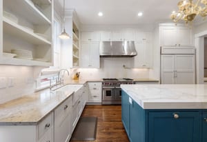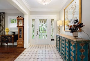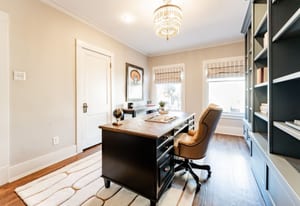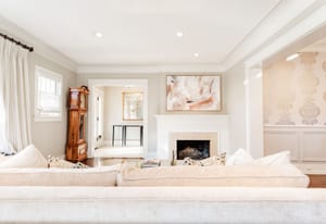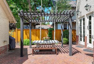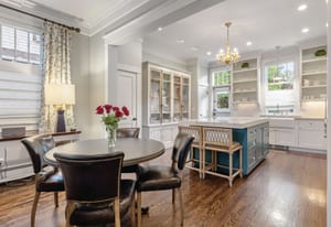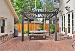 Architectural character shines throughout with dark hardwood floors, picture windows, Carrara marble, French doors, generous crown molding, custom built-ins, and vaulted, beamed ceilings. The kitchen offers exceptional functionality with two pantries, a 6-burner Wolf range, a European-style hutch, and casual dining space. It opens directly into the family room with a fireplace and three sets of French doors leading to the pergola-covered patio.