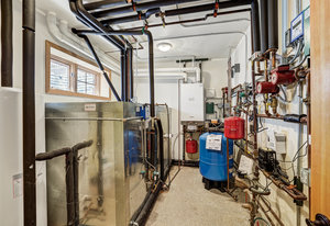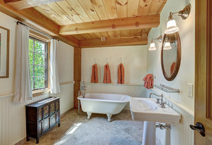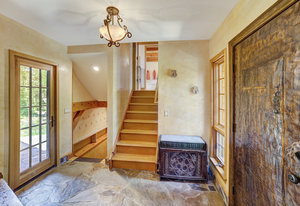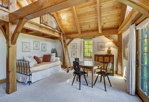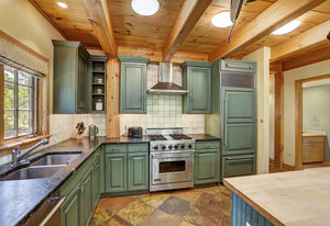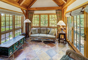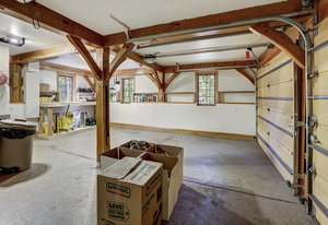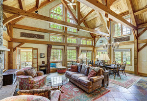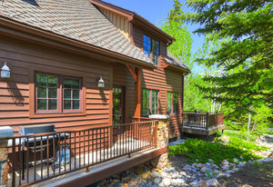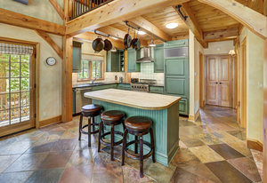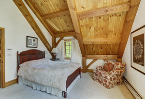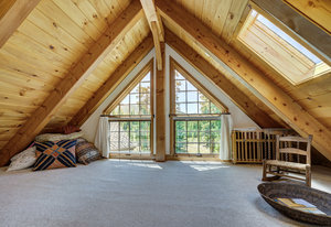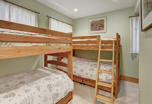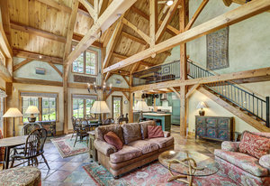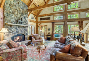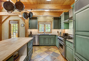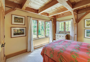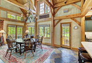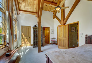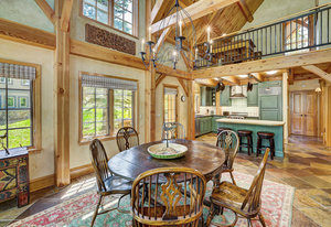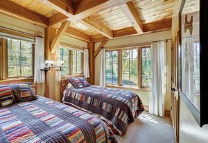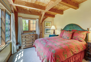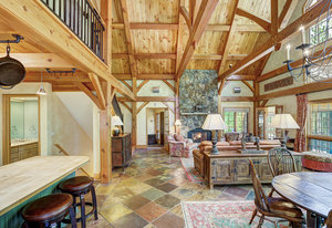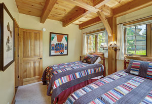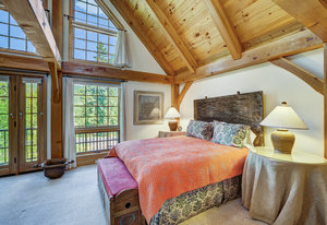 Inside, greet your guests in your flexible mudroom and enjoy a spacious main level with an open-concept layout connecting the dining area, kitchen, living room, and sunroom—perfect for gatherings and everyday living. The kitchen boasts a butcher block island, stainless steel appliances, and flows seamlessly to the outdoor composite deck space equipped with a built-in speaker and home audio system. Architectural features include a timeless and elegant use of Douglas Fir, Moss Rock, and Slate Tile with in-floor radiant heat. Two bedrooms on the main level allow your guests to have convenient access and views all throughout the main level.
