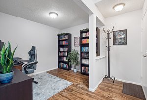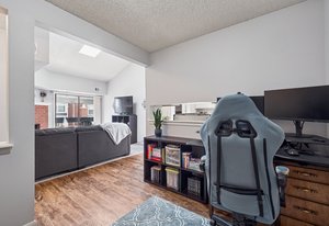 Just off the main living area is a versatile bonus space currently used as a home office and library, easily adaptable as a dining area, workout zone, or creative nook. The kitchen is both stylish and functional, featuring stainless steel appliances, white cabinetry, and durable LVT flooring.