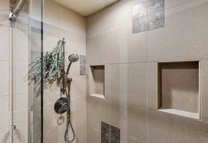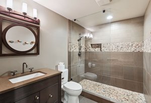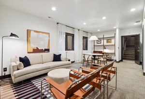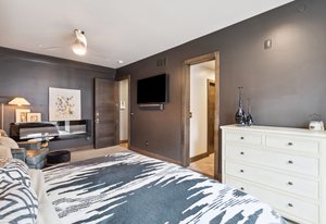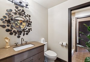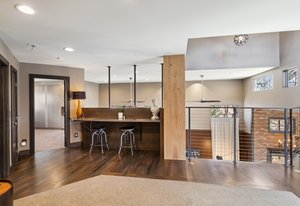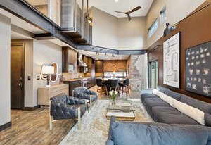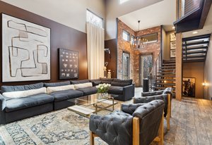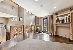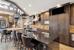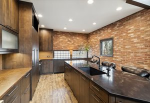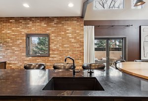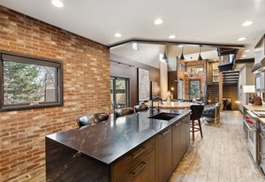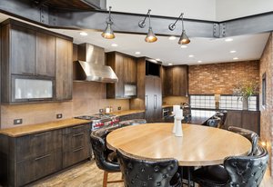 The open concept on the main level boasts a lofted archway adorned with cork ceiling, Venetian vintage wood tile floors with radiant heating, weathered steel beams, and a custom steel staircase built on-site. The chef’s kitchen is a showpiece, featuring Subzero freezer and wine refrigerator appliances, a Wolf dual-fuel range, a Cambria quartz waterfall island, custom alder wood cabinetry, exotic leathered Bronzite granite countertops, and striking stone veneer brick accents.