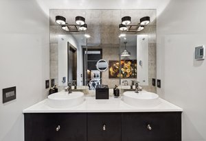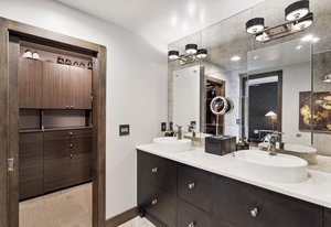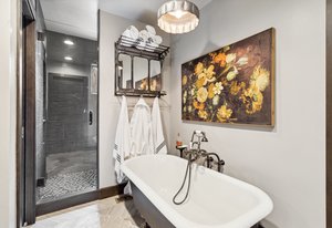 The serene primary suite showcases a restored 1910 farmhouse clawfoot tub with pewter-finished feet, custom Irpinia cabinetry, heated chevron-patterned limestone floors, and smokey mirror wall tile for a spa-like retreat.