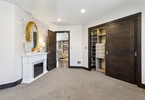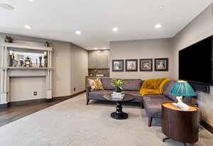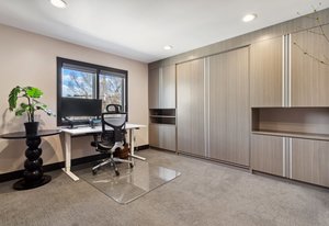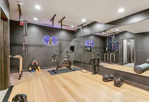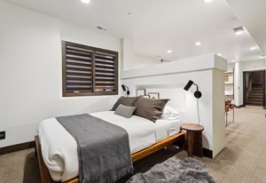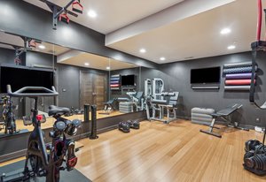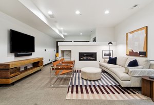 The upper loft family room features a floating steel-and-wood desk overlooking the great room below, two additional bedrooms, one with a custom Murphy bed, and premium finishes throughout. The finished basement includes a private gym area with floating Zenterra bamboo flooring and a spacious secondary suite with an Alpine Hearth gas fireplace.