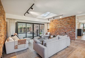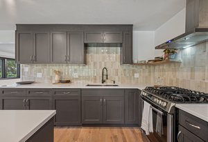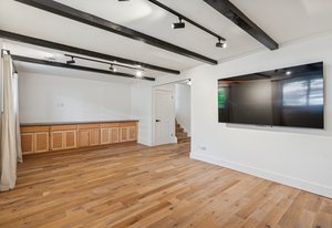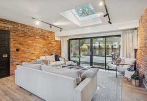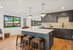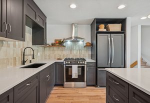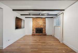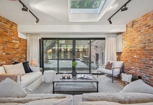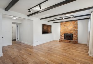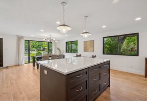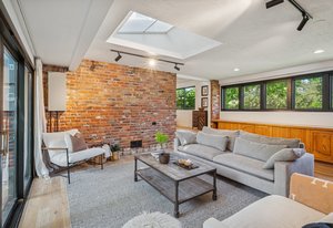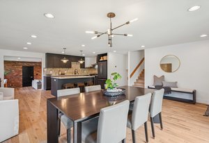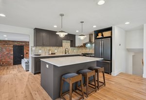 Inside, solid 5-inch oak hardwood floors span the main and lower levels, adding natural warmth and continuity. The open-concept kitchen features sleek quartz countertops, paneled appliances, a large center island, and a gas range—all designed to flow effortlessly into the surrounding dining and living areas. A cozy family room with exposed brick and oversized sliders opens to the backyard, creating a natural extension of the living space.