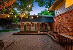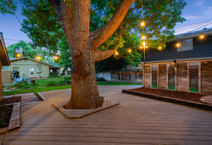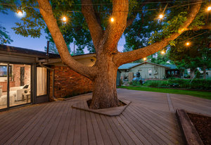 The backyard retreat features Trex decking, raised garden beds, layered landscaping, and string-lit trees that create a magical evening ambiance. A practical and well-kept storage shed adds function without disrupting the aesthetic.