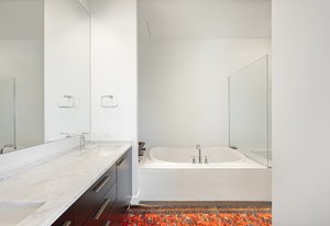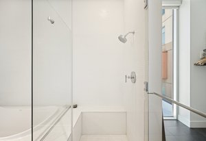The main level flows seamlessly from a dramatic living and dining area to a chef’s kitchen outfitted with top-of-the-line Fisher & Paykel and BEST appliances—perfect for entertaining. A sculptural floating staircase leads to an airy primary retreat and flexible guest suite or office. Indoor living extends outward to a private wraparound terrace of approximately 500 square feet, ideal for sunset dining or peaceful mornings with extraordinary mountain vistas and city views.