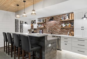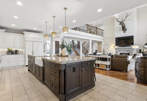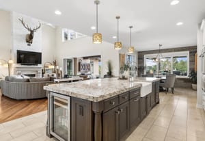The gourmet kitchen is a culinary enthusiast's dream, featuring a large island with ample seating, a beverage refrigerator, dishwasher, and an impressive amount of cabinet space that provides plenty of room for all your culinary essentials.