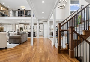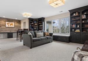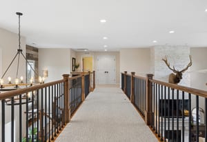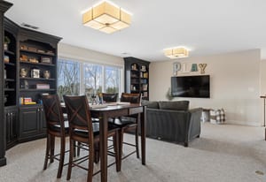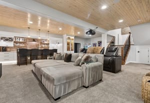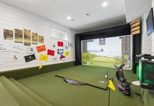The lower level is an entertainer's paradise, featuring a large screen projector for movie nights and football games, an expansive entertaining area with a bar, a golf simulator, and a gym area. This level also includes a guest bedroom with its own en suite bathroom, a game area, and a convenient half bath.