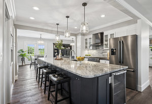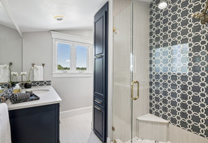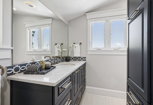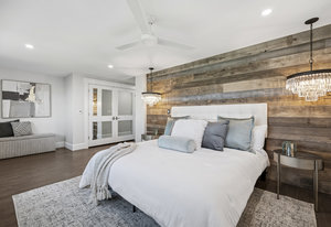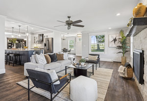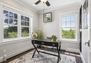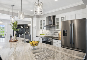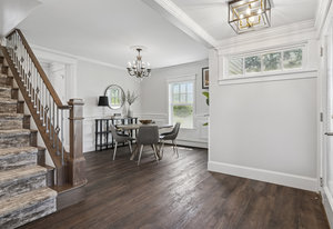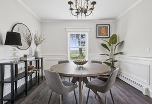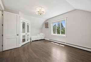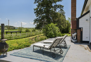 This beautifully renovated 3-bedroom, 3-bathroom farmhouse offers high-end finishes throughout. The chef’s kitchen is equipped with Bosch appliances, a 5-burner gas stove, Frigidaire beverage fridge, and a spacious island with built-in storage. In the living room, a limestone fireplace and detailed wainscoting create a cozy, elegant ambiance.
