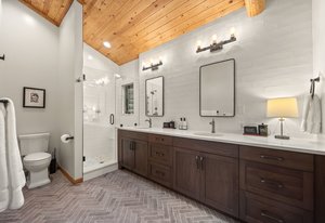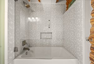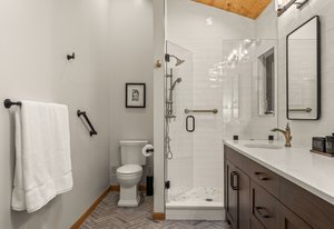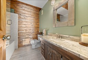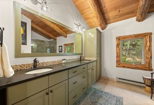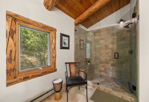 A large secondary bathroom, also added in 2022, continues the elevated design with a big walk-in shower and designer finishes. Multiple outdoor sitting areas throughout the property provide tranquil spots to relax, entertain, or simply take in the surrounding natural beauty.