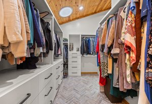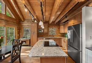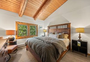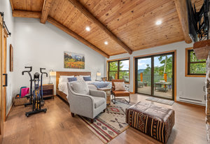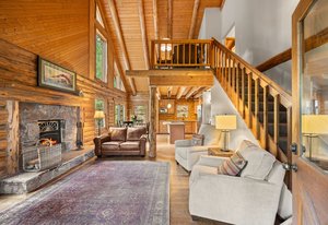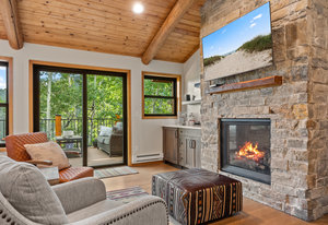 Originally built in 1988, the home has been meticulously updated to preserve its original character while introducing thoughtful modern touches. A stunning addition completed in 2022 creates a luxurious primary suite sanctuary, complete with vaulted ceilings, a private deck with panoramic views, a large walk-in closet with exceptional storage, and a spa-inspired bathroom featuring crisp finishes, a herringbone brick floor, and a generous walk-in shower. The suite is truly a retreat, featuring its own floor-to-ceiling stone fireplace and a built-in coffee bar for cozy mornings and relaxing evenings.