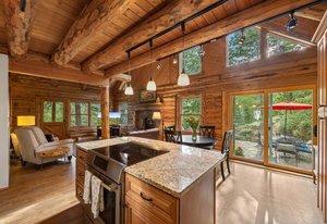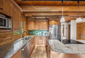 The heart of the home is a warm and inviting two-story great room with soaring ceilings, wood beams, and a woodburning fireplace. The great room flows seamlessly into the kitchen and dining area, creating an open-concept space ideal for gathering and entertaining. From here, step directly onto expansive decks that invite you to enjoy fresh Colorado air, sunshine, and peaceful views.