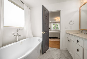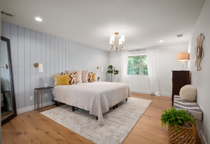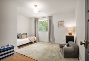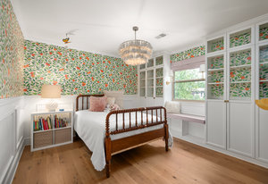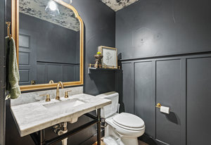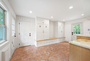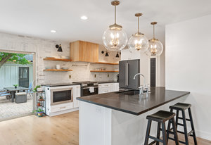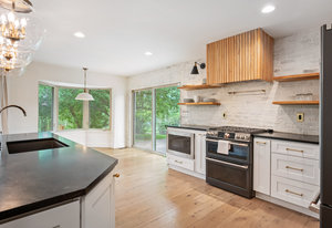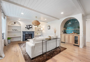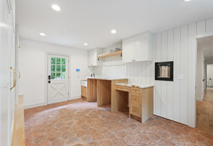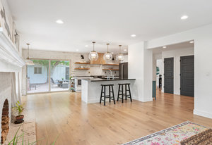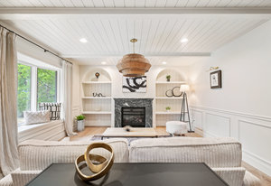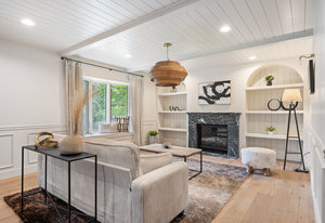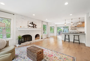 SPACIOUS, LIGHT FILLED LIVING ROOM is accented w/ Frame Molding, Arch Bookcases, Granite Mantled Gas Fireplace, Built in Bar, Ice Maker, Wine Frig & Window Seat. Large Dining Room easily hosts Table for 10+. Inviting Family Room hosts wood burning fireplace & Surrounded by Windows overlooking the Sprawling Back Yard while opening to Kitchen's Soapstone Bar. Kitchen includes Stainless Appliances, High End Dual Oven, 6 Burner Gas Stove w/ Skillet & Professional Grade Ventilation while being softened by Accents of White Washed Exposed Brick, A Board & Batten Vent Facade & Open Shelving. A Main Floor Office is tucked away for Privacy. Retro Vibed' Powder Room. Oversized Mudroom + Laundry Room w/ Customized Organization System.