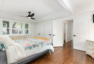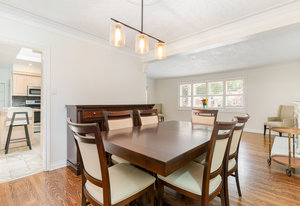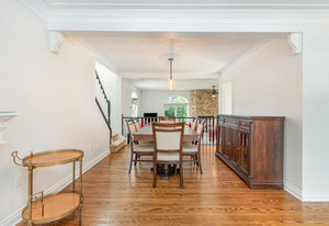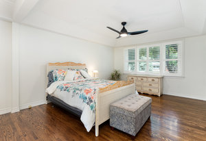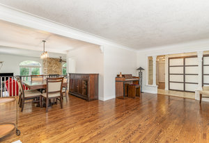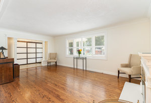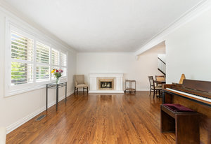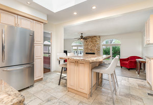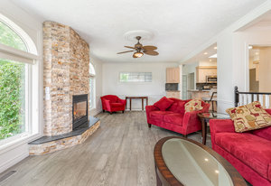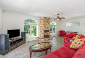 The sunken family room is filled with natural light from large fan-transom windows affording picturesque views of the private backyard oasis. A striking floor-to-ceiling stone fireplace adds warmth and architectural character.