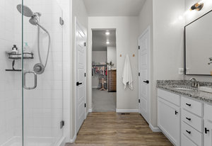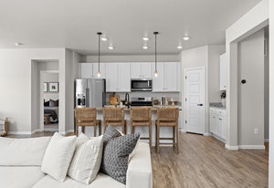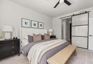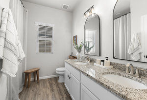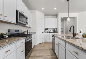 The chef’s kitchen shines with a generous island, abundant cabinetry, stainless appliances, and expansive granite counter space, all flowing seamlessly into the dining and living rooms to create a warm sense of connection. The sunlit primary suite is a true retreat, featuring dual sinks, a spacious walk-in shower, and direct access to the upgraded master bath with a custom sliding door. Two additional bedrooms share a stylish hallway bath, offering flexibility for extra space, guests, or a home office.
