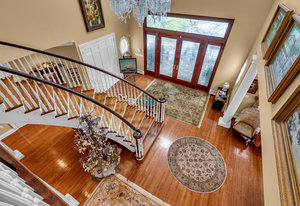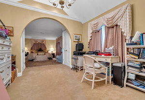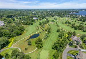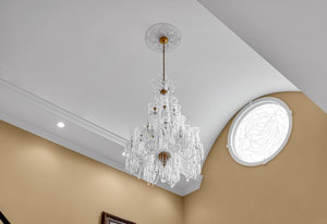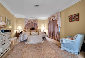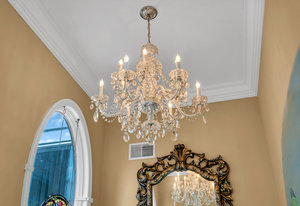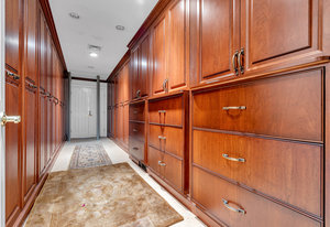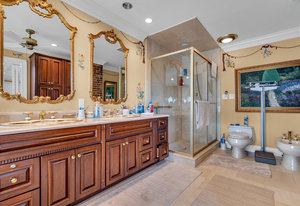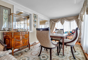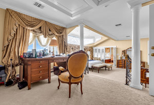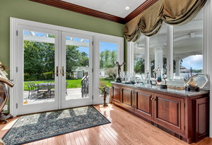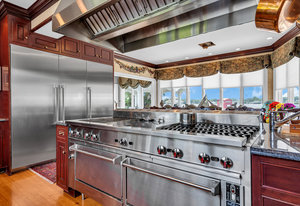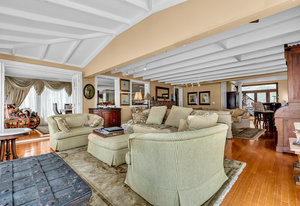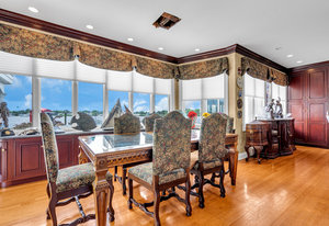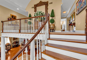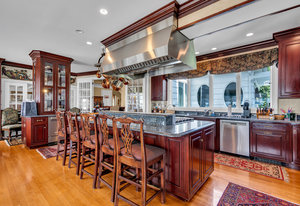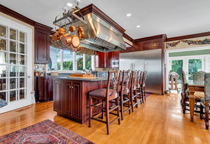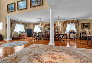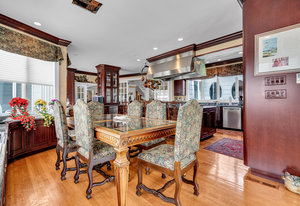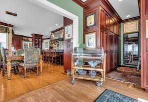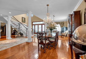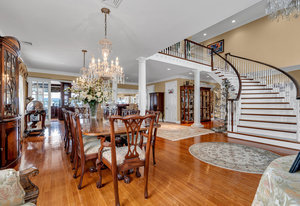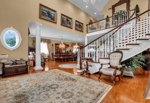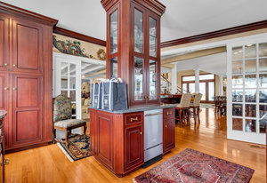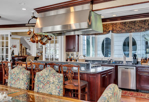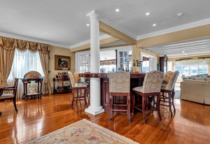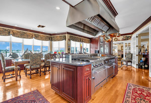 Enter through etched glass doors into a soaring foyer adorned with a grand staircase and sparkling crystal chandelier. The formal dining room is anchored by a circular bar, perfect for entertaining. A stunning great room showcases a fireplace, beamed ceilings, and a dramatic wall of windows with panoramic river views, flowing seamlessly into the breakfast room and gourmet chef’s kitchen. Outfitted with cherry cabinetry, commercial-grade appliances, an oversized island with gas cooking, granite counters, and built-ins—including an icemaker and pantry—this kitchen is as functional as it is impressive.