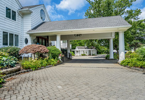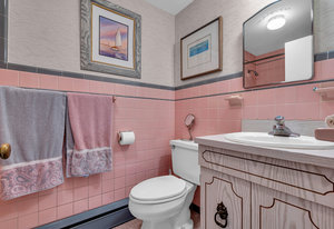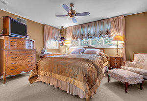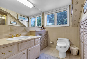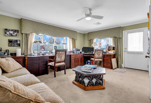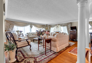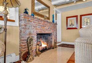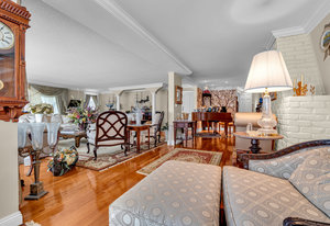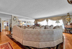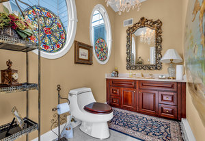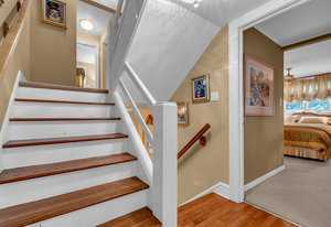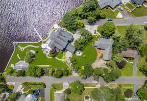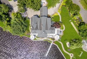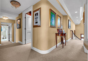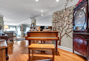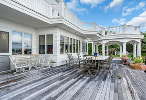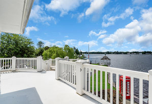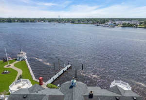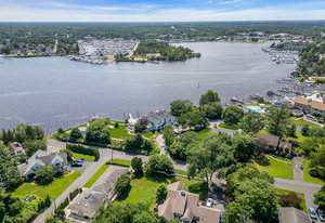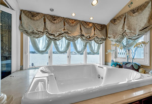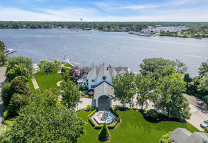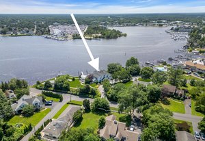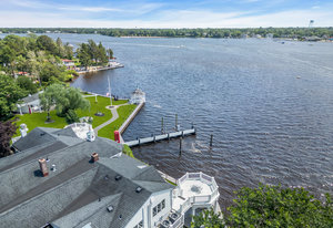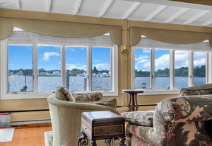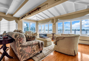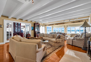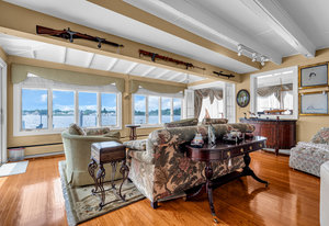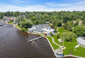 A formal living room, also overlooking the water, completes the main level, which features rich hardwood flooring throughout. Additional highlights include a chair lift to the garage level with laundry and workshop space, and an elevator providing easy access to the second floor.