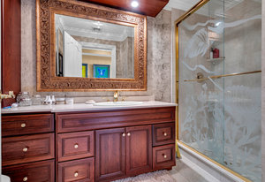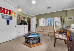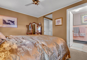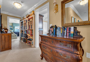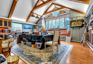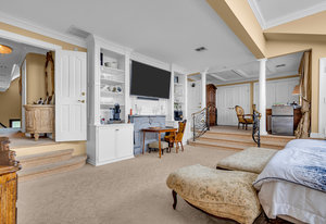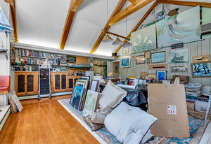 Upstairs, the luxurious primary suite boasts breathtaking river views, double closets plus a separate dressing room with cold storage, and a spacious ensuite bath. Three additional bedrooms each offer private baths and balcony access. A fourth bedroom is currently used as an office, and a bonus room with beamed ceilings serves as a versatile hobby space, home office, or studio.