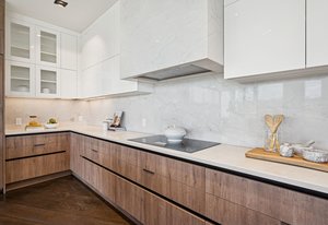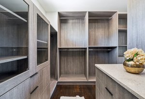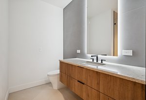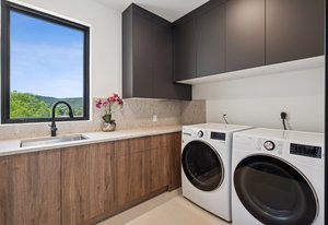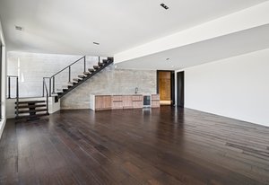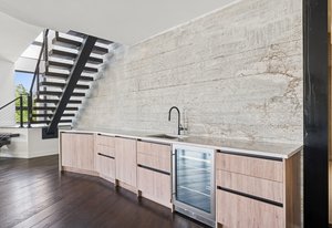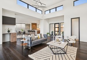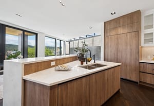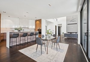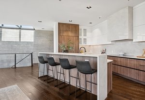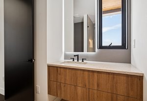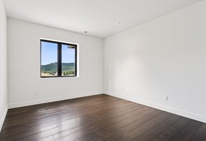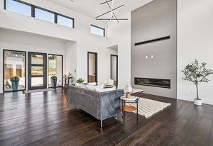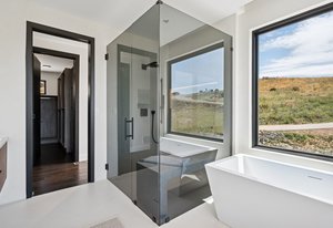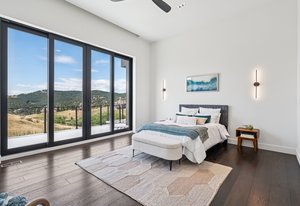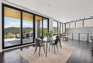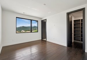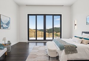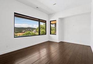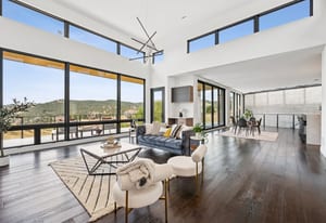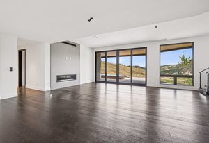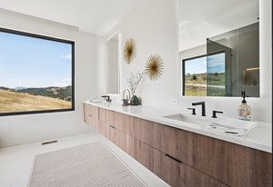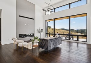 Expansive Andersen windows frame sweeping mountain views, filling the home with natural light. High ceilings and warm oak floors create an airy sophistication, while built-in cabinetry and two fireplaces add modern function and comfort. The open-concept design flows into a chef’s kitchen featuring Dacor appliances, Hansgrohe fixtures, Marfa cabinetry, and a dramatic natural stone waterfall island positioned to capture the mountain vistas.