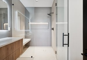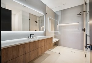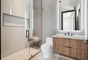 The primary suite is a private retreat with an oversized walk-in closet, spa-inspired bath, floating vanities, and a freestanding soaking tub. Three additional en suite bedrooms, a media room, fitness/flex space, and a wet bar provide space for both relaxation and entertaining. Smart thermostats, a home security system, and a dual Trane heating system ensure comfort and peace of mind.