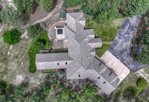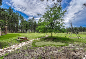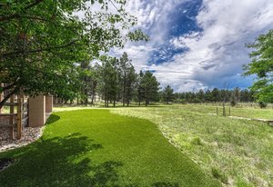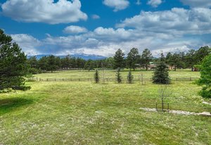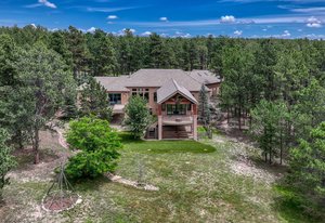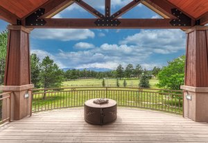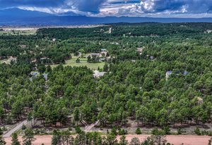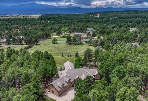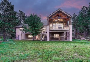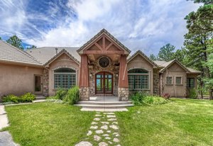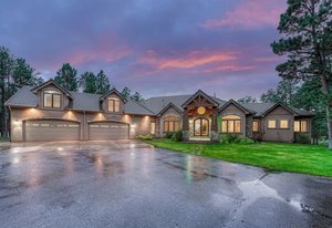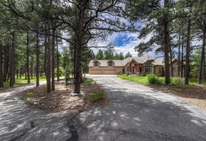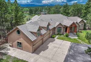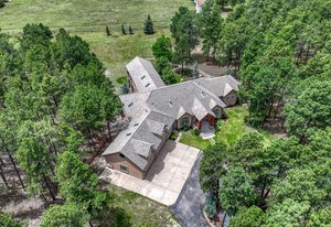 Inspirational architecture, sweeping views of Pikes Peak and the mountain range which makes this special home feel like you are worlds away but only mere minutes from modern conveniences in the uber desirable South Black Forest. Almost 7,500 sq ft and nestled on 5 acres that is the perfect mixture of towering ponderosa pines & lush meadows and wildflowers. The exterior of the home has a captivating style with exposed timber, stucco, concrete tile roof, lush processional landscaping and two types of stone with massive high end metal clad windows. Upon entering through the double glass door entry you are greeted by expansive rooms, stone and hardwood floors, towering vaulted ceilings, art lighting and curved architectural lines. The formal living room has a wall of windows, gas fireplace, hardwood floors and built-ins. Massive main level great room opens to a 3 season room and a double door walk-out to the large covered back deck with a gas fireplace and unobstructed views. Located in award-winning District 20. 5 bedrooms, 5-bath home and a 4 car attached garage. Modern kitchen w/ hardwood floors, stainless steel appliances, Subzero refrigerator, gas range, double oven, & a large center island. The primary suite has a gas fireplace, 5-piece updated bath, walk-in closet, & private balcony with hot tub—ideal for relaxing under the stars with Pikes Peak & mountain views. The finished walkout basement is designed for entertaining, w/ a wet bar including dishwasher & mini fridge, home theater, family room w/ gas fireplace, & a gym space with water drinking fountain & full bath plumbed for a sauna, two additional bedrooms, & full bath. A finished loft above the garage is perfect for a studio, office, playroom, or guest retreat. This property offers the best of Black Forest living—privacy, beautiful home and views only minutes of Colorado Springs. Amazing close by outdoor recreation at Section 16 and Pineries Open Space w/ miles of trails and hundreds of acres of open space.