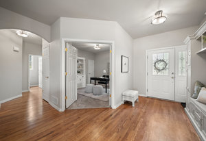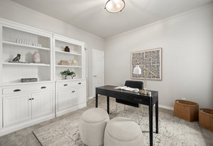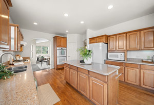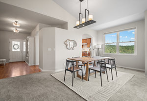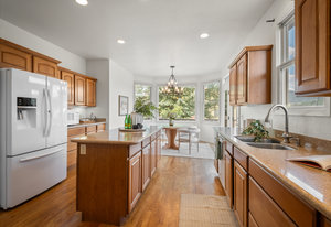 The main floor features a spacious primary bedroom suite, a dedicated home office, a convenient laundry room, and beautifully flowing living spaces. The lovely kitchen is a chef’s dream, complete with a granite island, upscale appliances, hardwood cabinetry, and abundant workspace. A sunny breakfast nook with a bay window captures serene mountain views, while the formal living and dining rooms are centered around a warm gas log fireplace—perfect for entertaining or quiet evenings in.