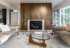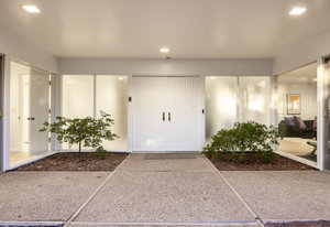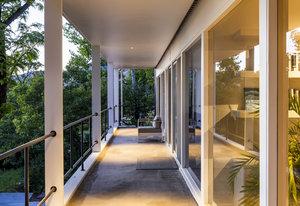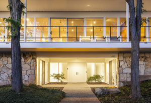 This home has always been a favorite-quiet from the street, almost secretive in its presence. But once invited in, its architectural story unfolds in brilliant layers. The proportions are impeccable throughout. The main approach is a gesture in symmetry and balance, anchored by a wide path that aligns precisely with the double entry doors. Above, the second story glows like a stretch of sunset horizon, with floor-to-ceiling windows that span the entire length of the home. A veranda cantilevers over stone walls. Inside, a five-foot-wide gallery hall extends from end to end, leading to a perfectly framed, north-facing glass wall that prompts moments of connection with the outdoor landscape.