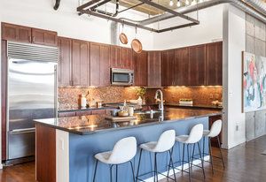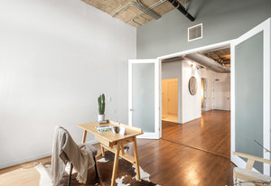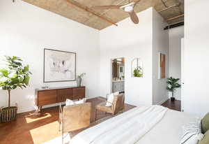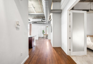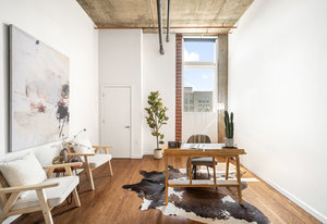 The open-concept living and dining areas flow seamlessly into a contemporary kitchen anchored by a generous island—perfect for entertaining. High-end finishes are balanced by organic textures, including hardwood floors, concrete ceilings, and gallery-worthy wall space ideal for art collectors. French doors open to an expansive covered terrace—complete with gas and water lines—offering a seamless indoor-outdoor flow and the perfect setting for al fresco dining, morning coffee, or evening unwinding.