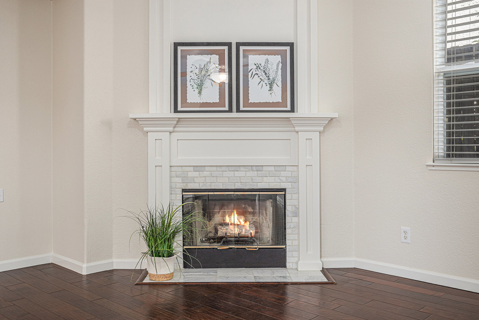 The adjacent family room invites relaxation with a gas fireplace framed by a stunning craftsman-style floor-to-ceiling mantel, creating a warm and inviting space to gather.