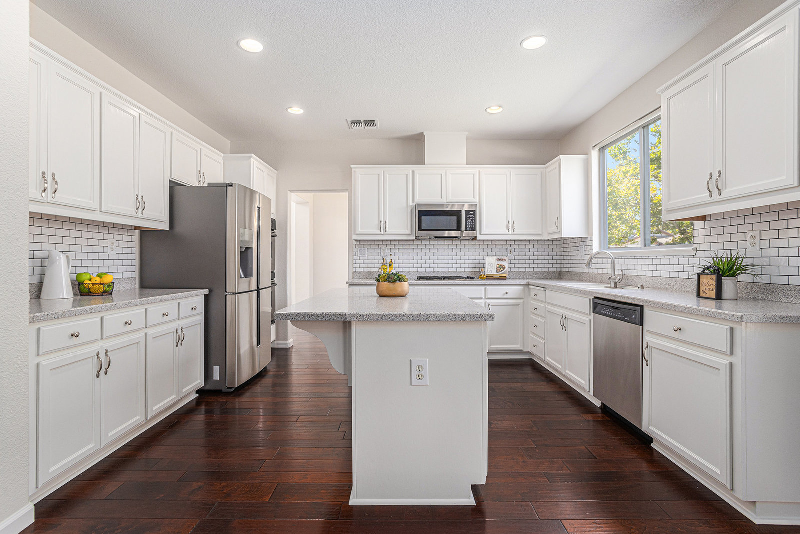 The formal living room offers a calm setting for guests, while the separate dining room is perfect for hosting family dinners and holidays. At the heart of the home is the expansive kitchen, complete with pepper ivory Corian countertops, a large kitchen island with breakfast bar, subway tile backsplash, stainless steel appliances, double oven, and a walk-in pantry/utility storage ares, perfect for both everyday use and entertaining.